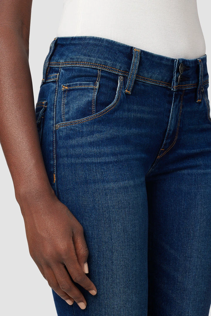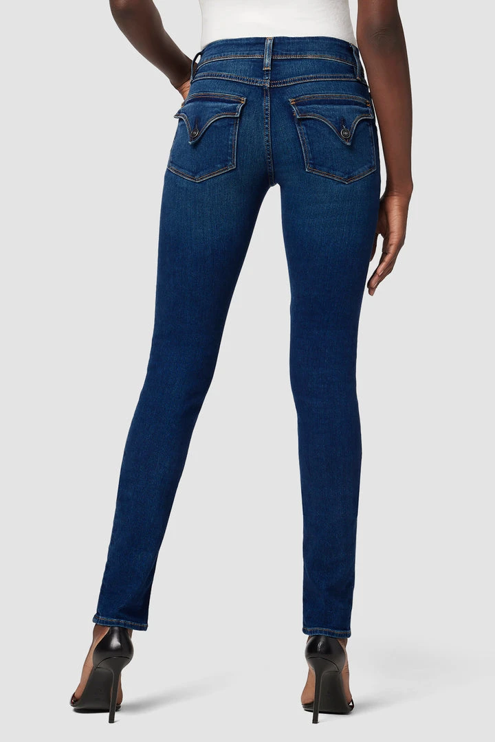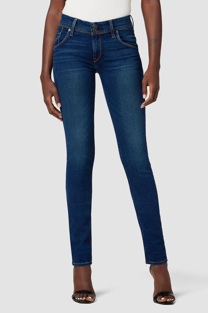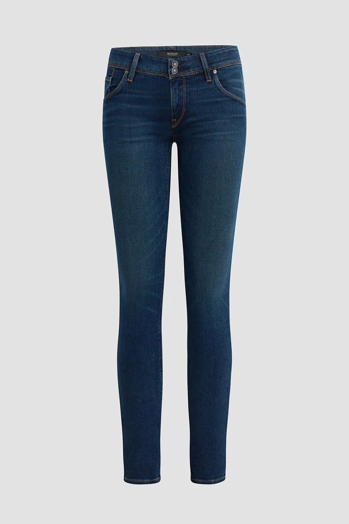 Cut with a longer inseam premium power stretch denim that smooths, sculpts, and will never sag, our Collin Mid-Rise Skinny Supermodel Jean in medium-dark indigo Obscurity features classic contrast stitching, subtle fading, and our signature button-flap back pockets. Runs true to size.