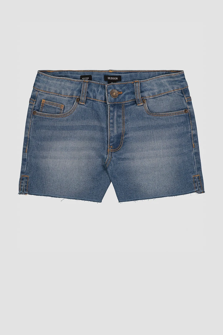Our Cut Off Side Vent Short, sizes 7-16, in medium indigo True Blue is a new warm-weather favorite. Features classic five-pocket details and frayed hems.