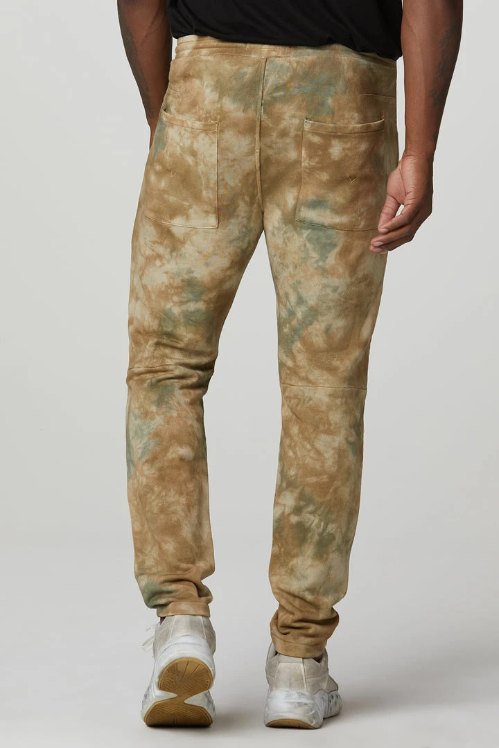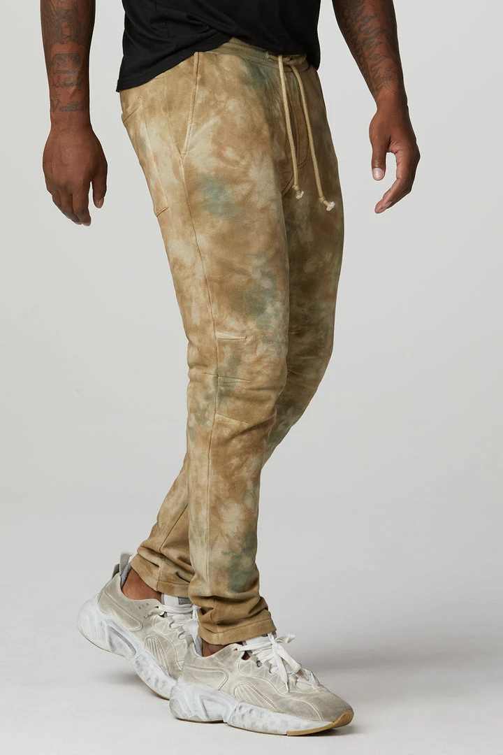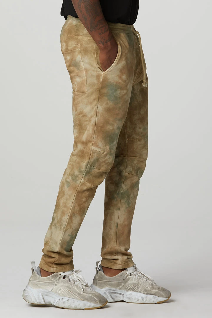 Cut for an easy fit from ultra-comfortable french terry, our Darted Sweatpant in tie-dyed Camo features a drawstring waistband, two back pockets, and darting at the knees.