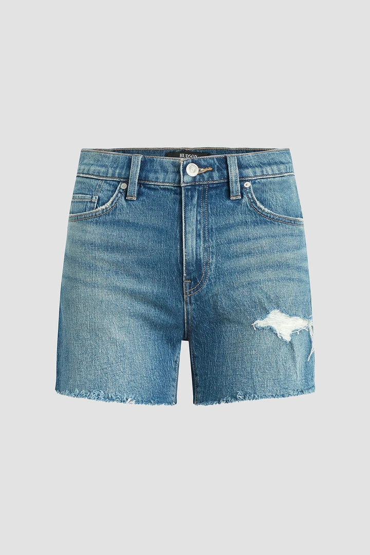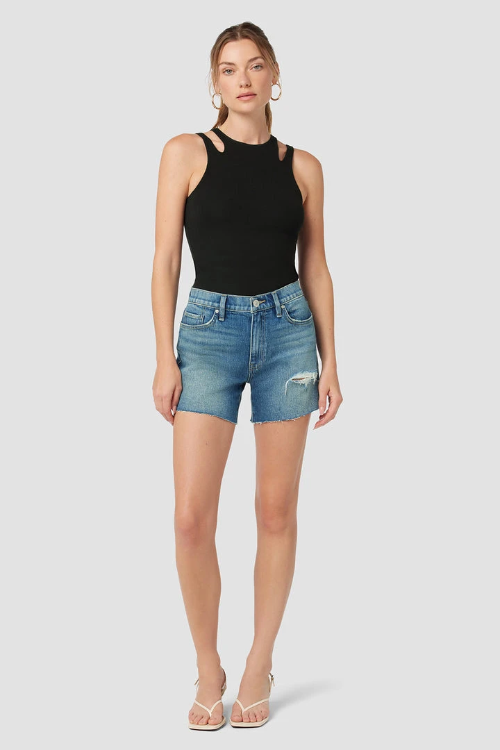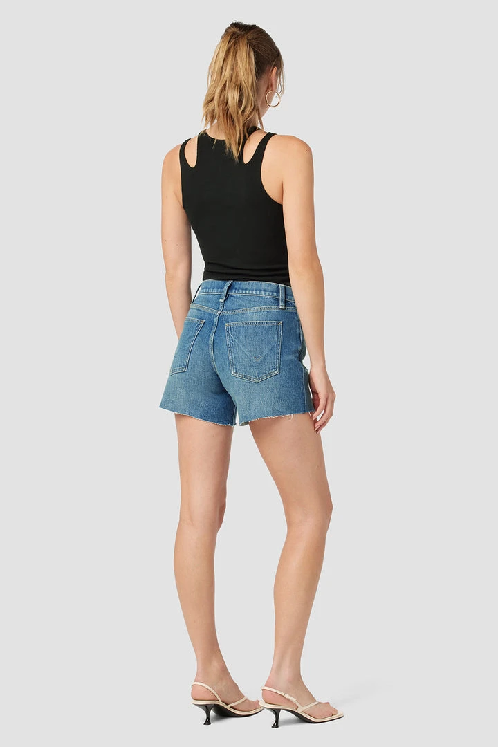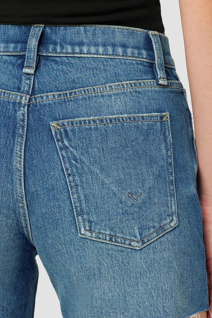 Made from premium comfort stretch denim, our Devon High-Rise Boyfriend Short in medium indigo Surf City features a flattering high rise, long inseam, and casual cutoff hem.
