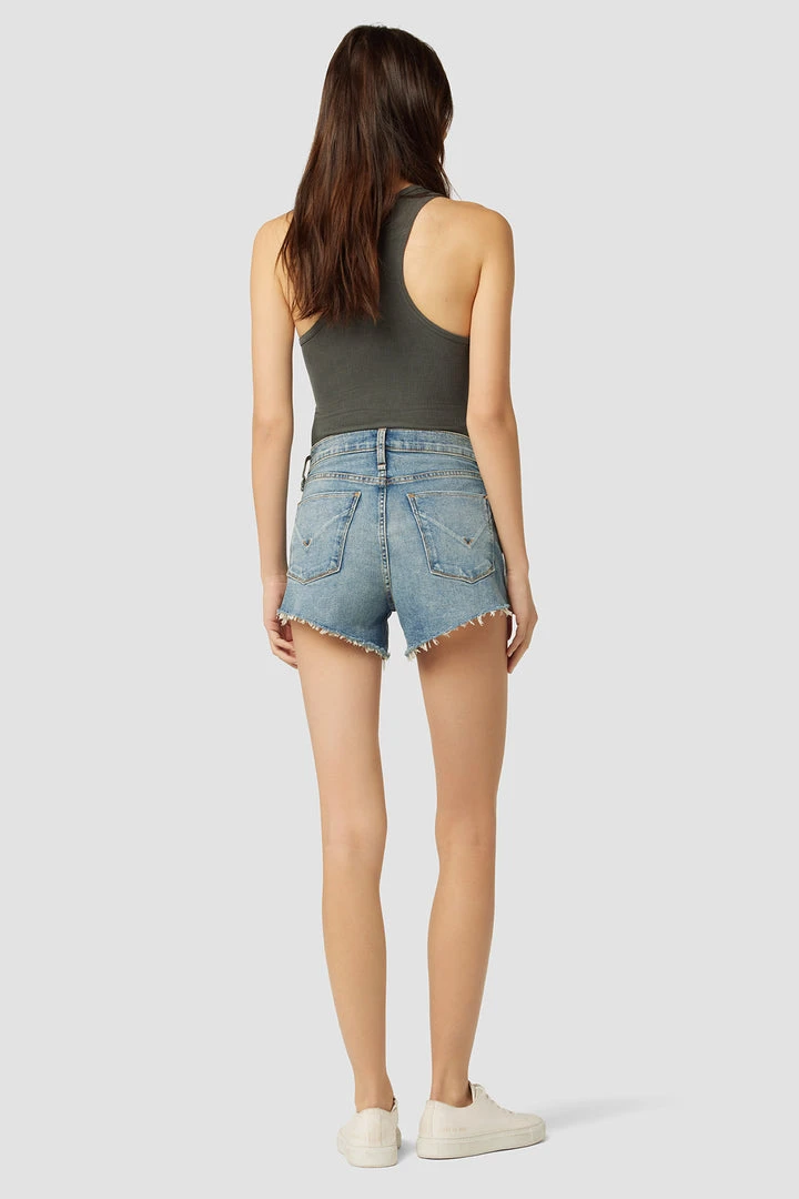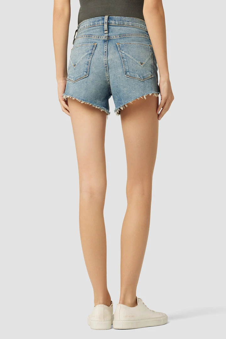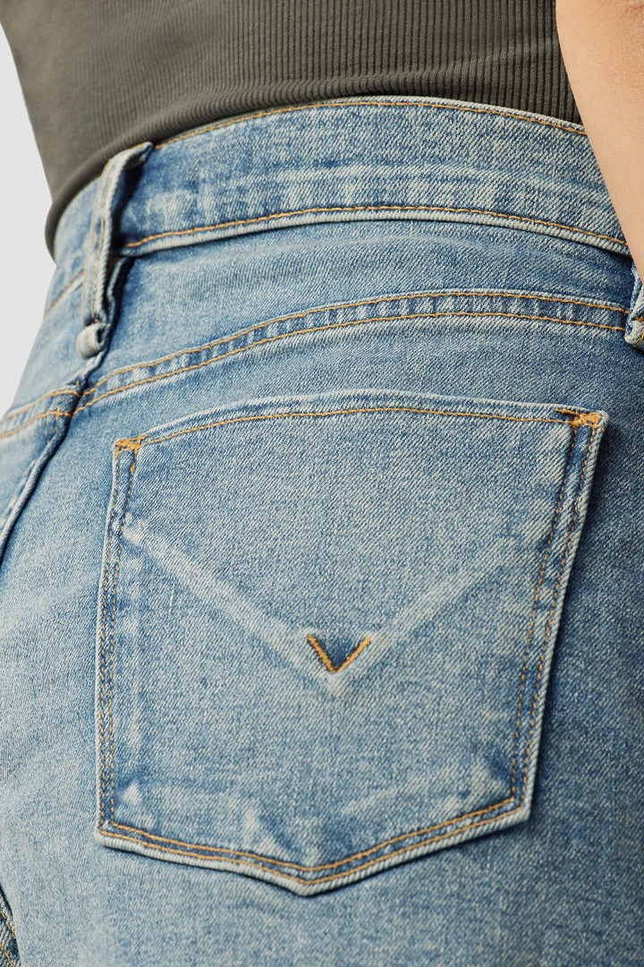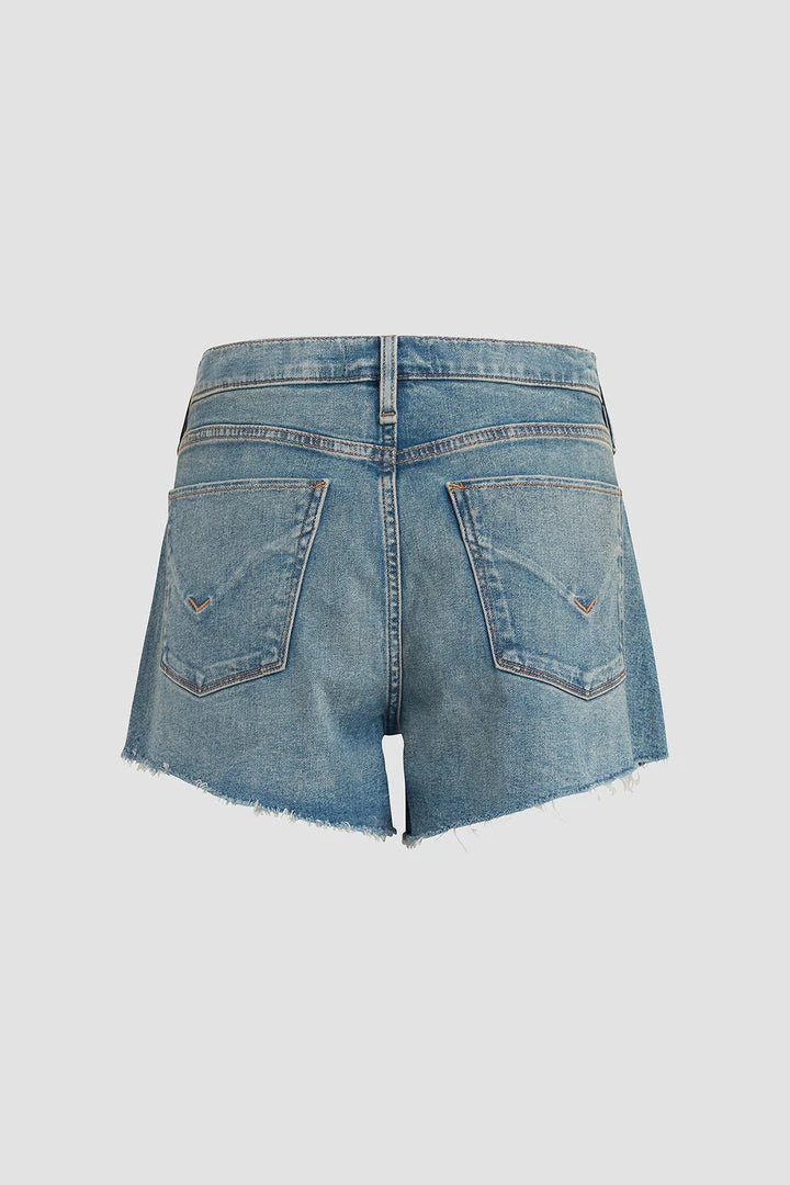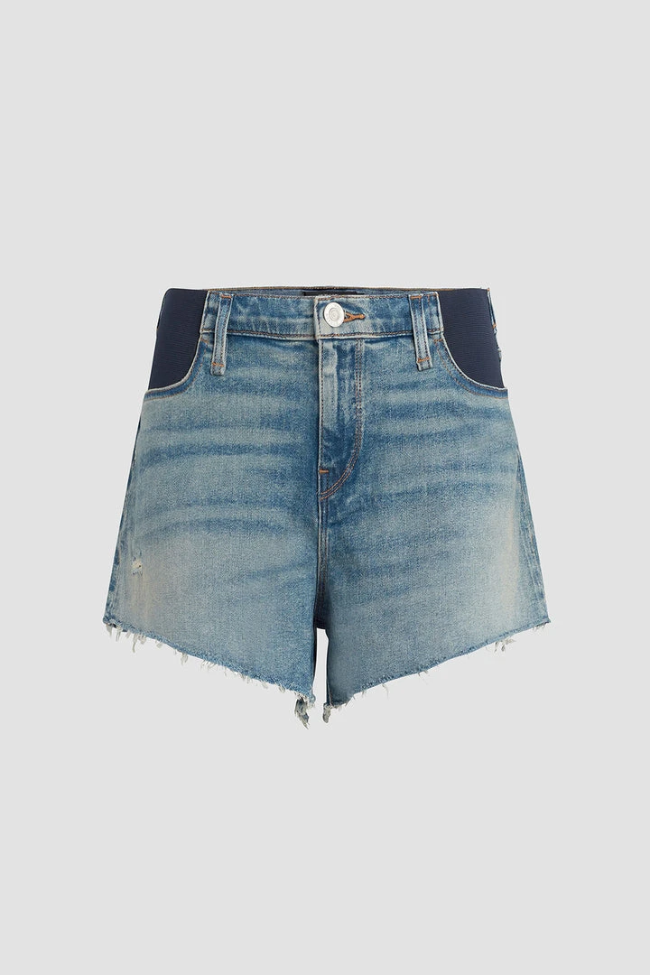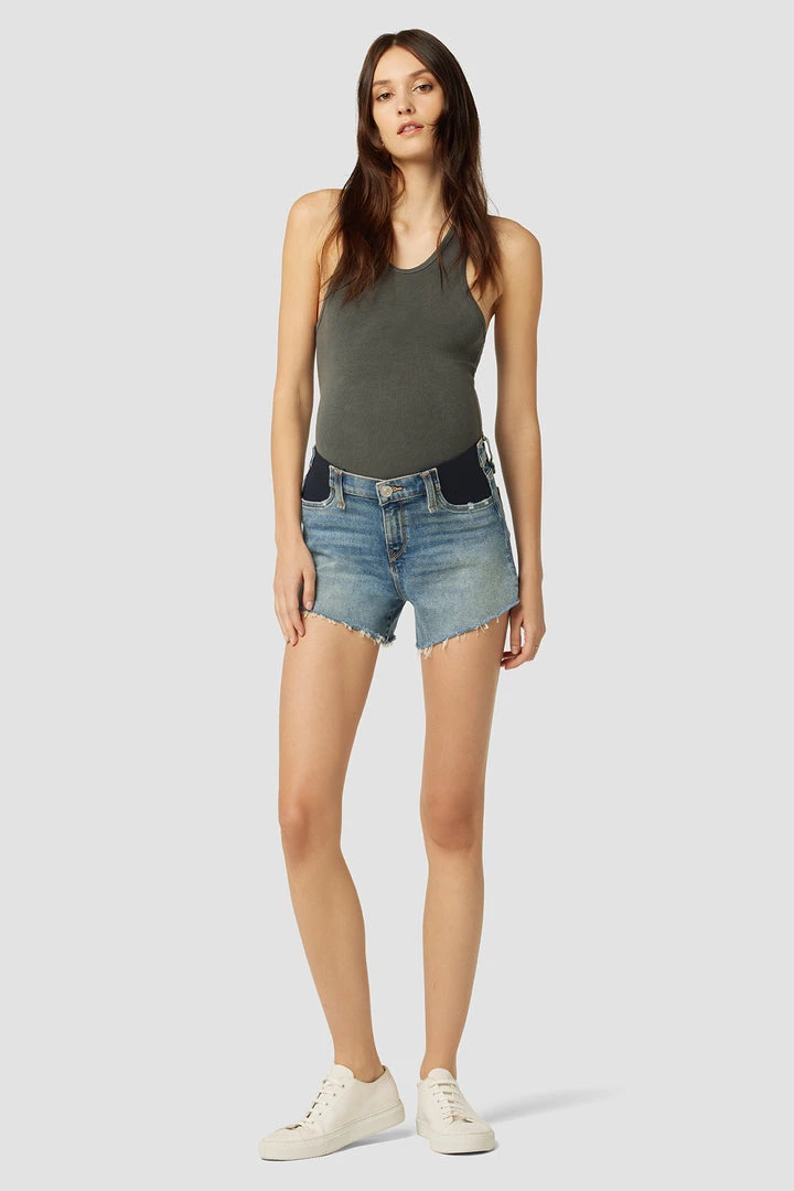 Designed with elastic panels for added comfort and support, our Gemma Maternity Mid-Rise Short in medium indigo Pearls is a mid-rise, relaxed-fit pair crafted from premium stretch denim with a cutoff hem and classic five-pocket details.