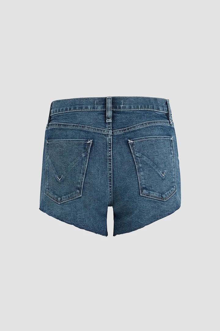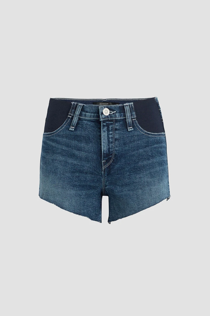 Designed with elastic panels for added comfort and support, our Gemma Maternity Mid-Rise Short in medium indigo Seasons is a mid-rise, relaxed-fit pair crafted from premium stretch denim with a cutoff hem and classic five-pocket details.