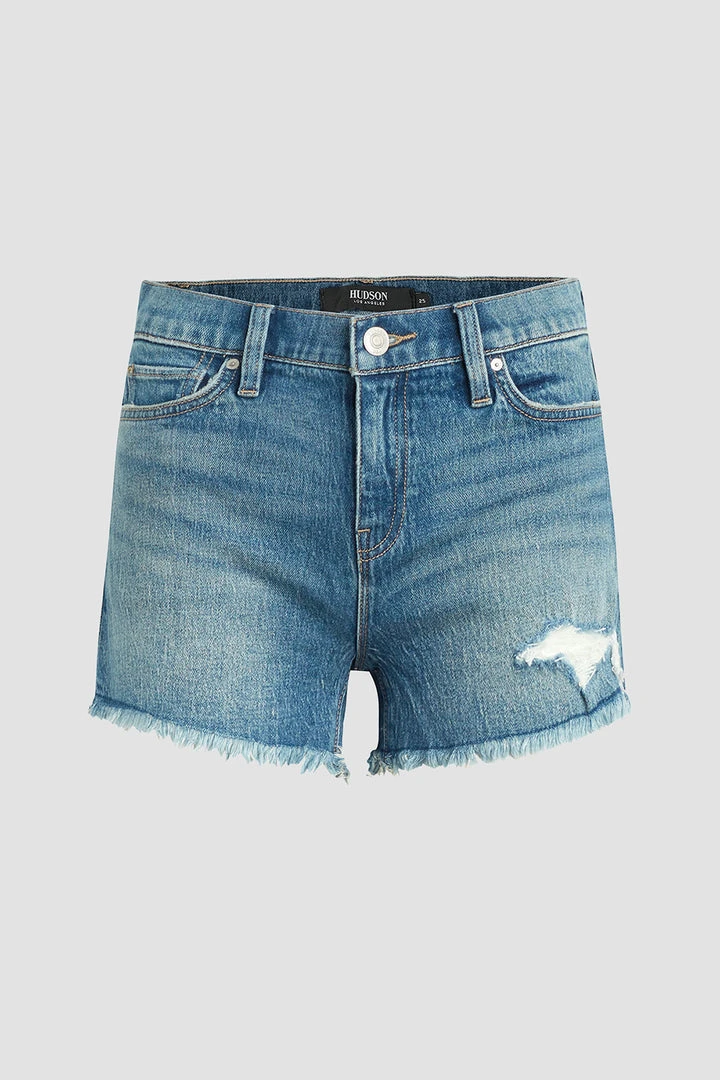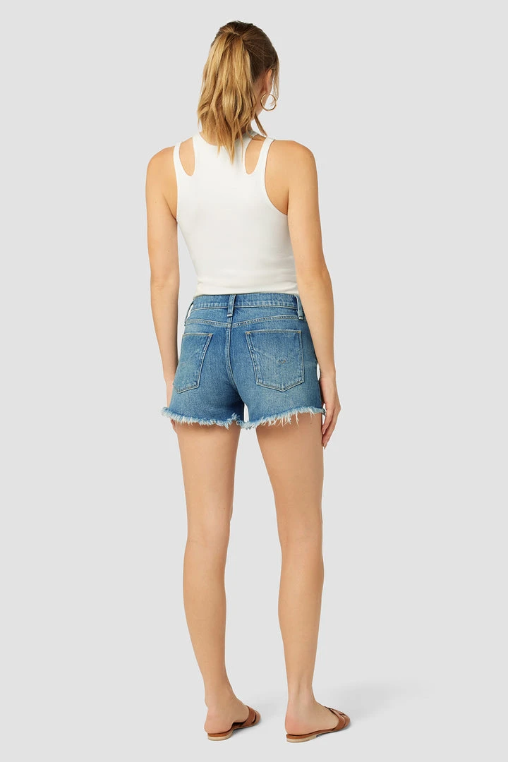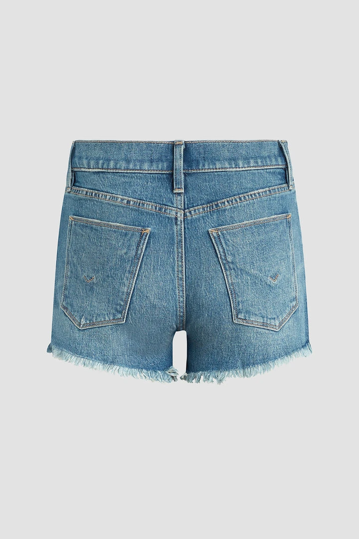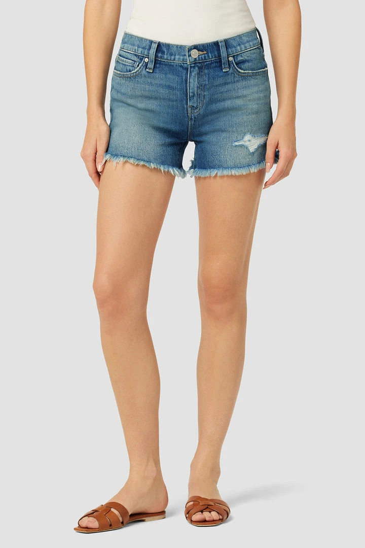 Our Gemma Mid-Rise Short in medium indigo Surf City is a mid-rise, relaxed-fit pair crafted from premium comfort stretch denim with classic five-pocket details, destruction, and a cutoff hem.