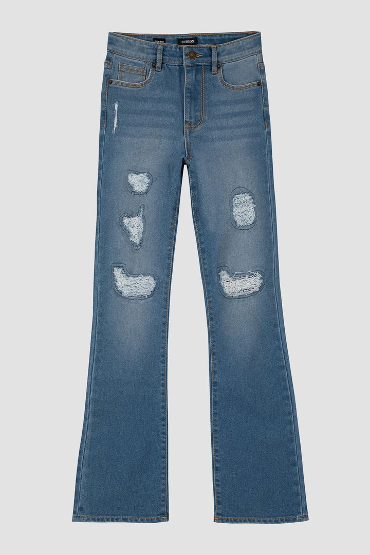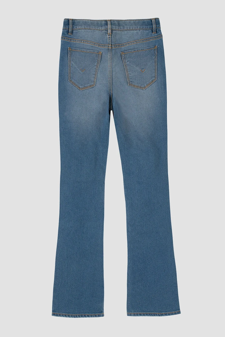 Our High Rise Flare, sizes 7-16, in True Blue is cut for a slim, flared-leg fit from premium stretch denim with a vintage look and feel.