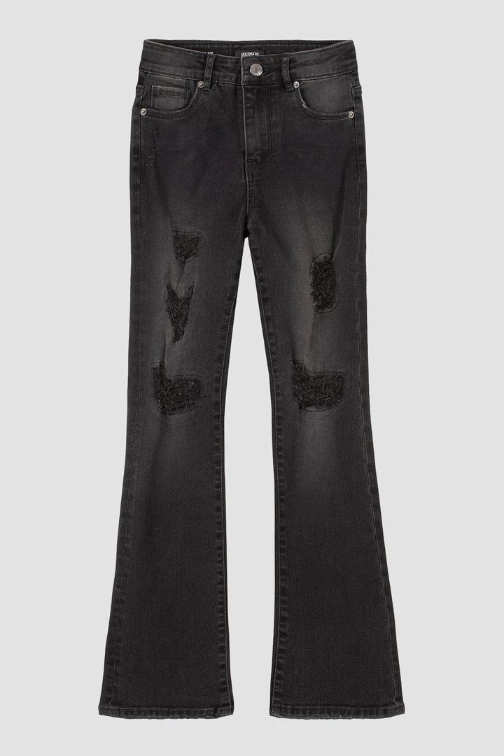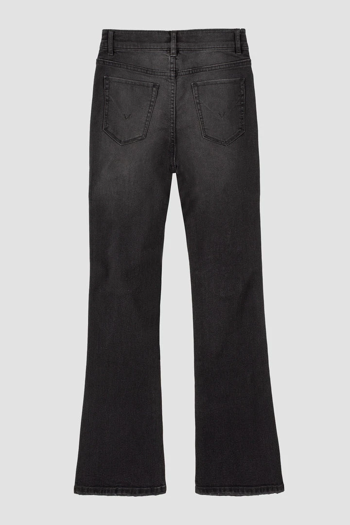 Our High Rise Flare, sizes 7-16, in Washed Black is cut for a slim, flared-leg fit from premium stretch denim with a vintage look and feel.