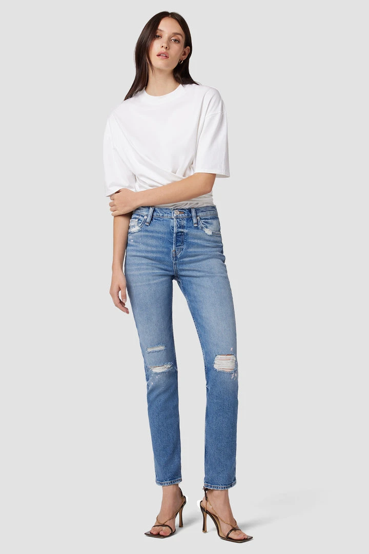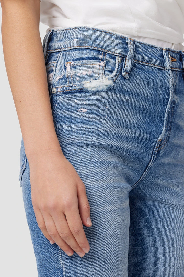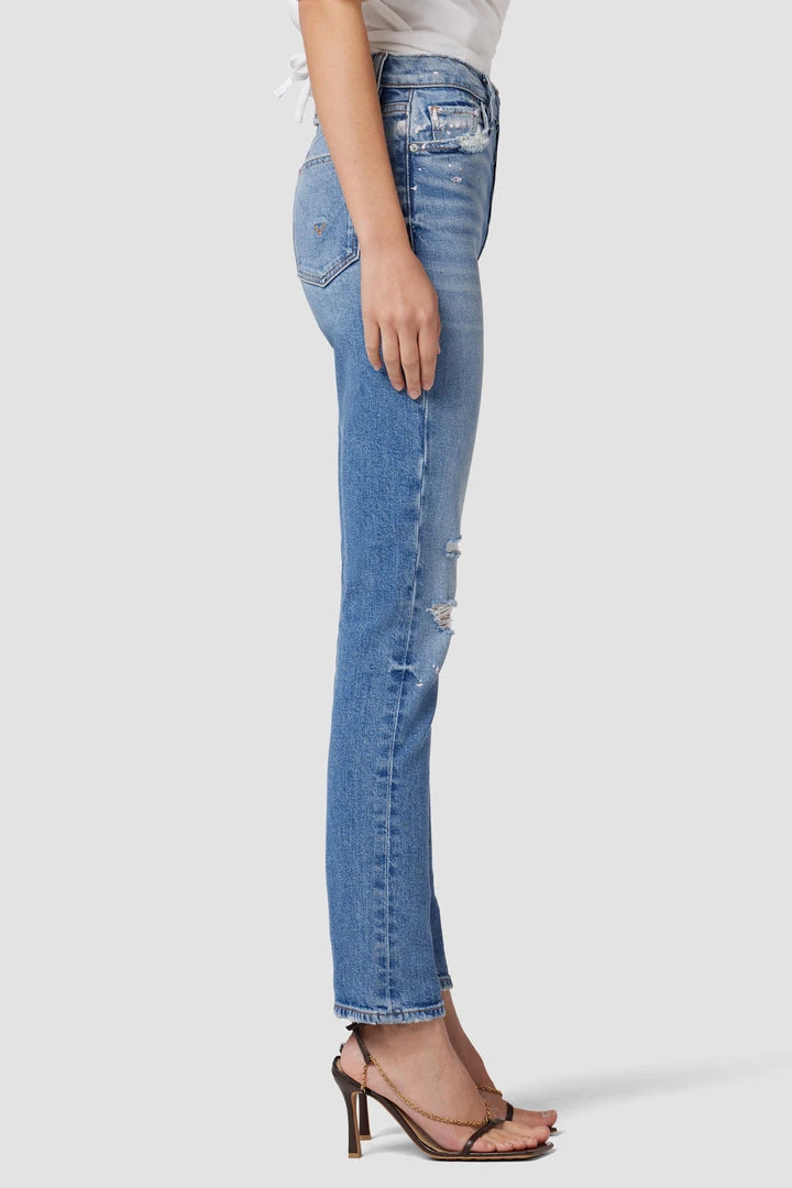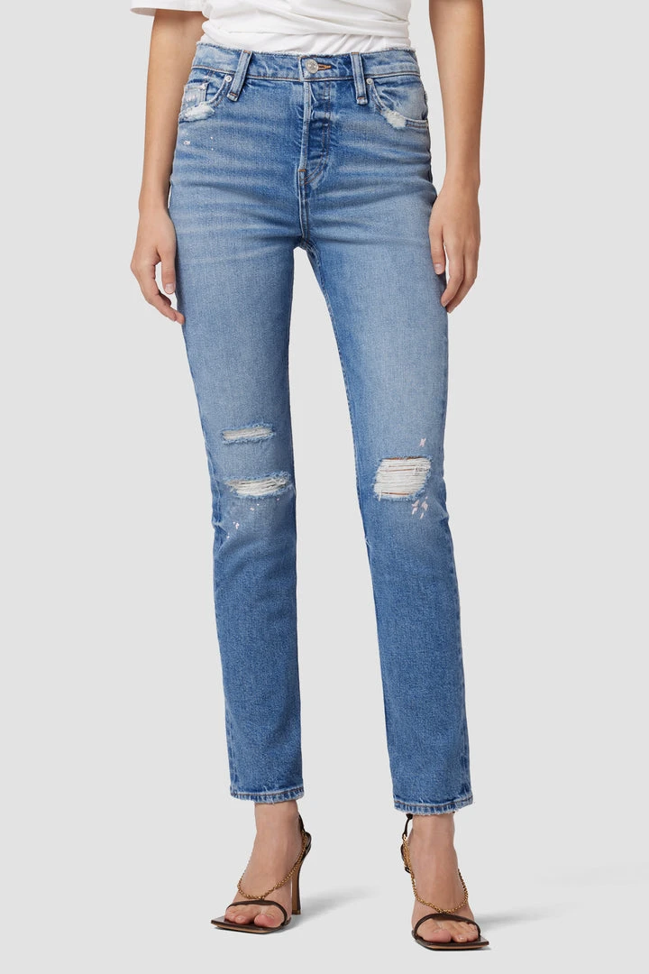 Our Holly High-Rise Straight Jean in medium indigo Skyscraper is cut from premium comfort stretch denim washed to vintage perfection. Features heavy destruction, bleach spots, and classic five-pocket details.