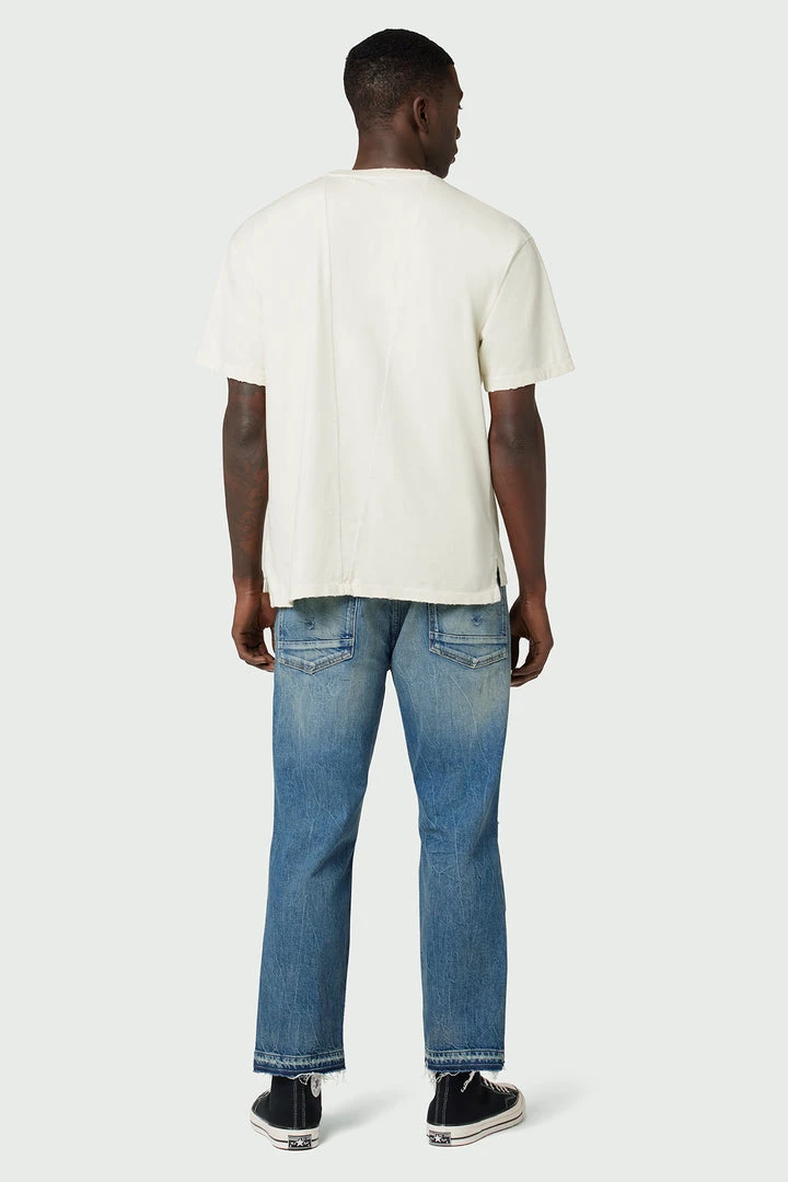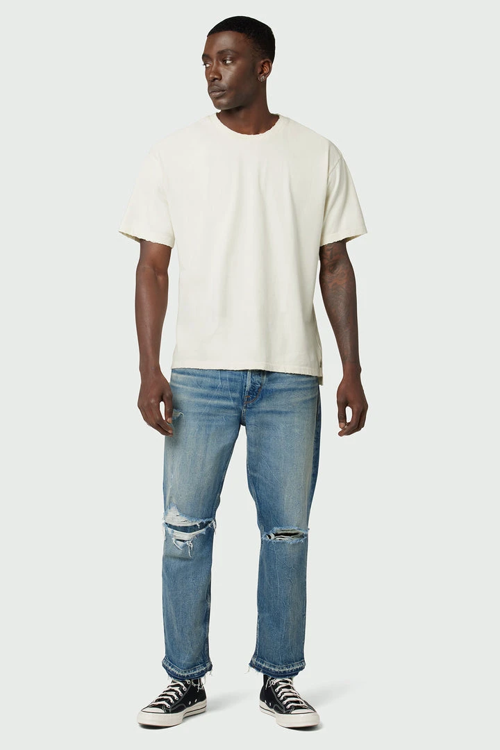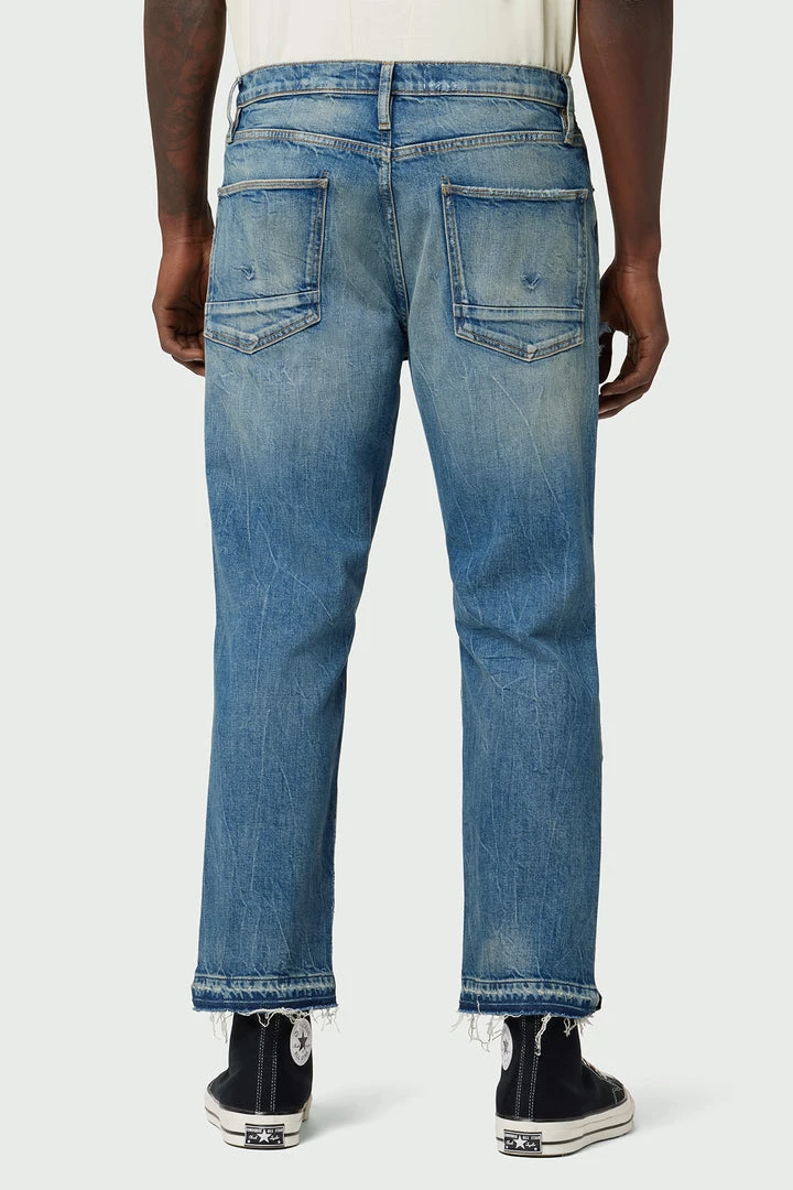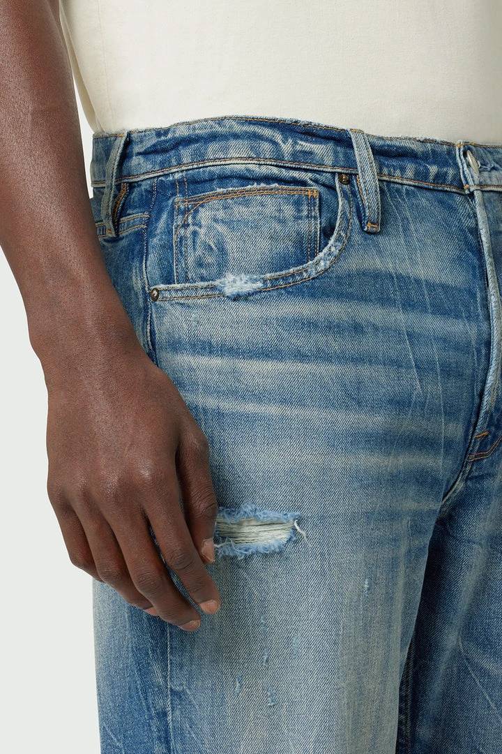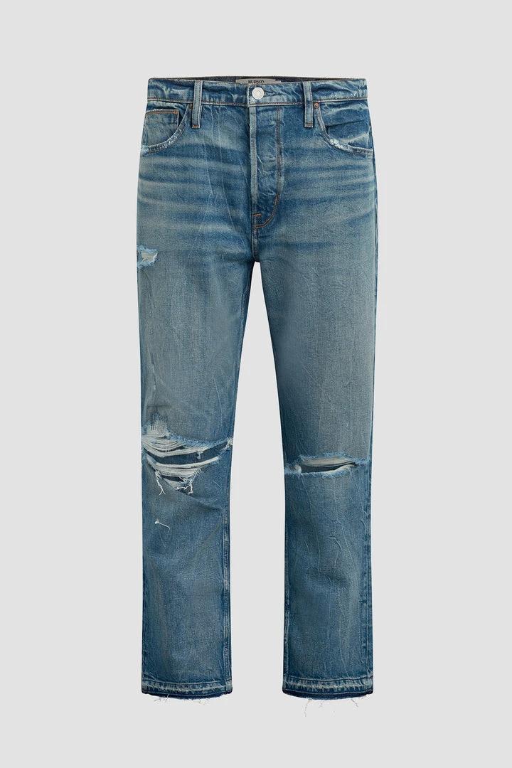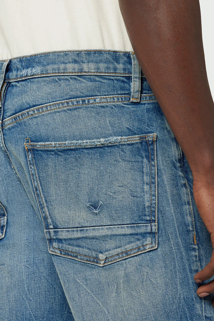 Our Jackson Straight Leg Jean is cut from premium comfort stretch denim in a mid-rise, straight-leg fit. The medium indigo Worker wash is heavily faded and destructed for a well-worn look.
