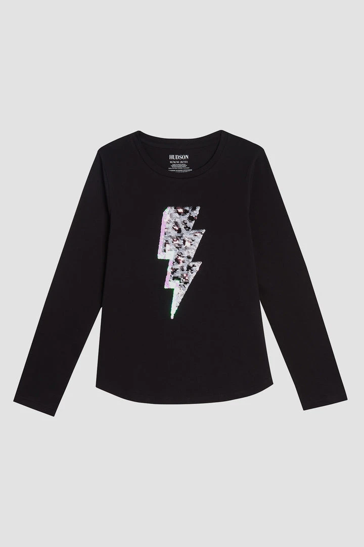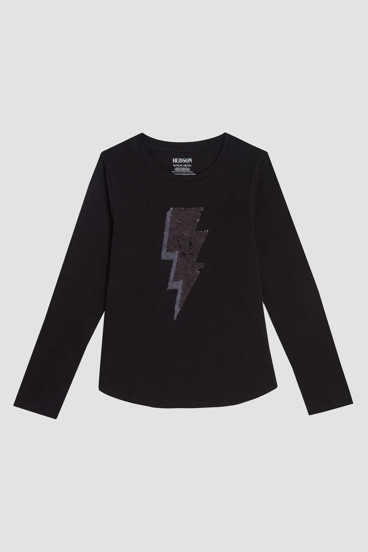 Our Lightening Tee, sizes 7-16, in Black is cut from a soft cotton jersey with long sleeves, a shirttail hem, and a leopard sequin lightning bolt graphic.