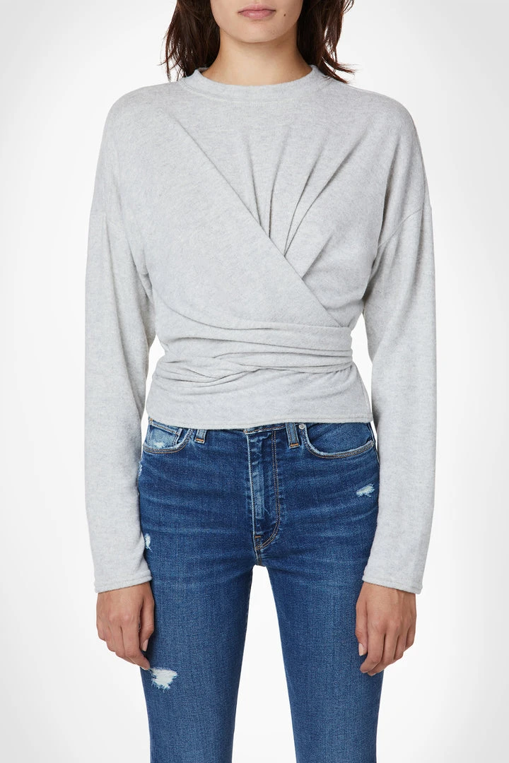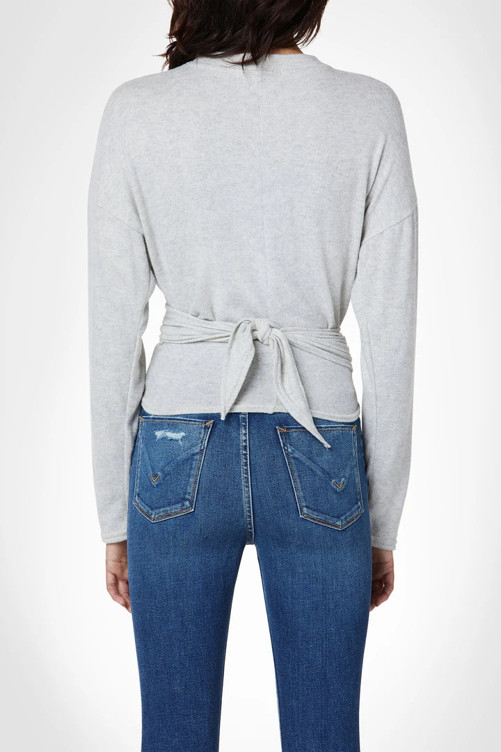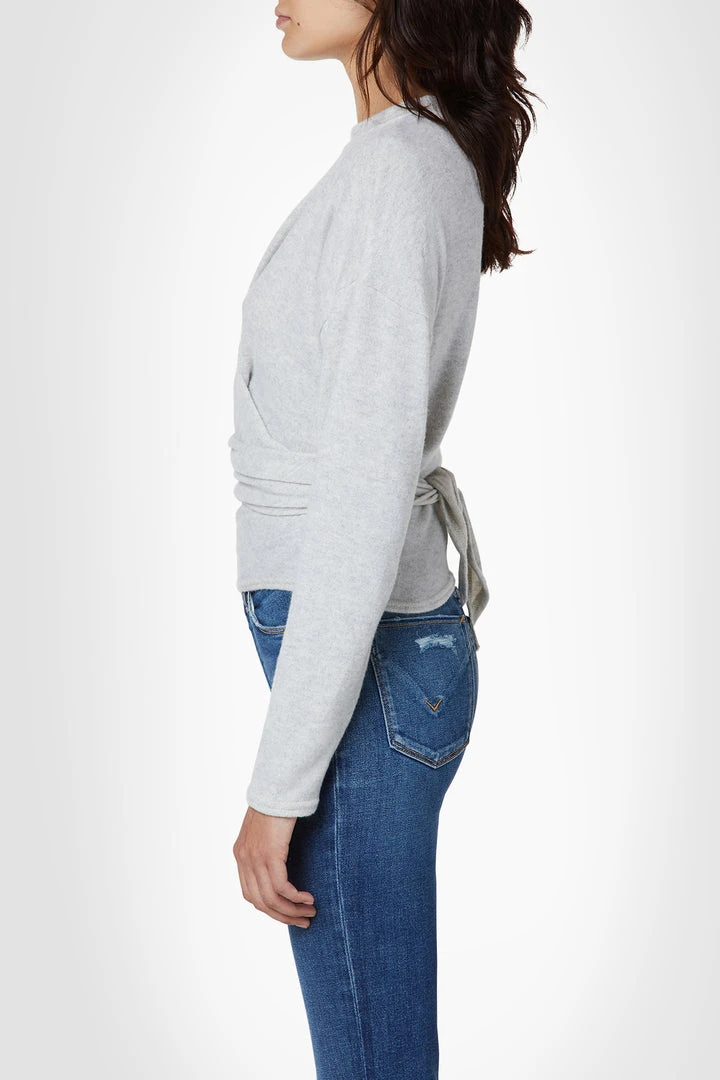 Our Long Sleeve Wrap Top in Light Oatmeal Heather is a soft, fitted knit featuring a crew neckline and wrapped waist with adjustable ties.