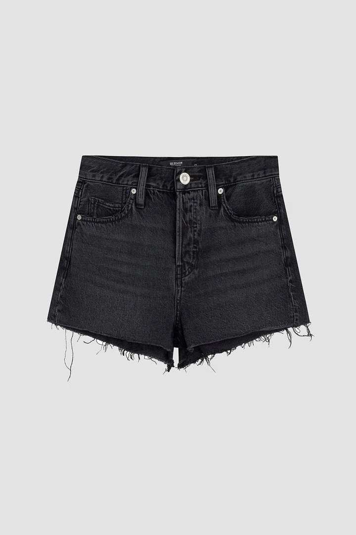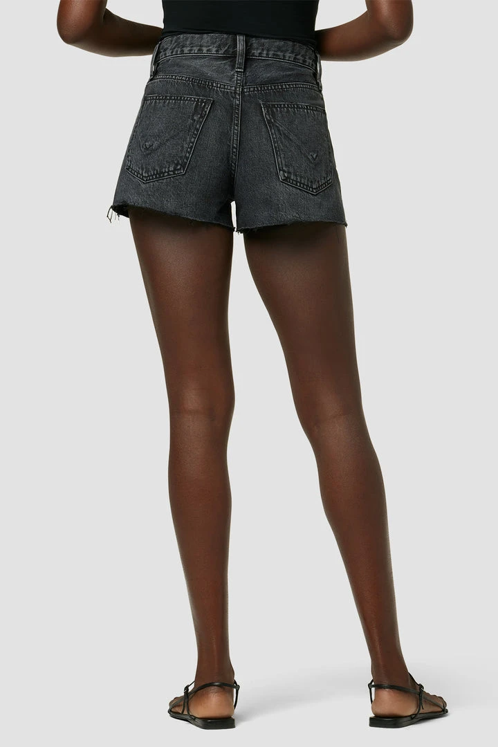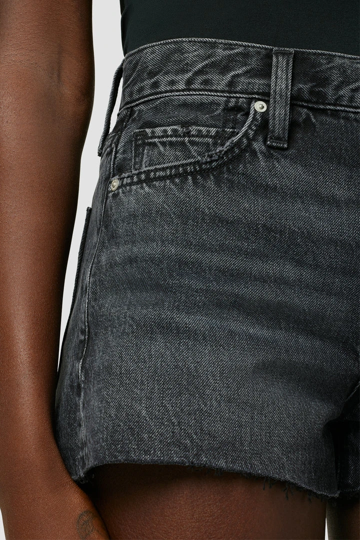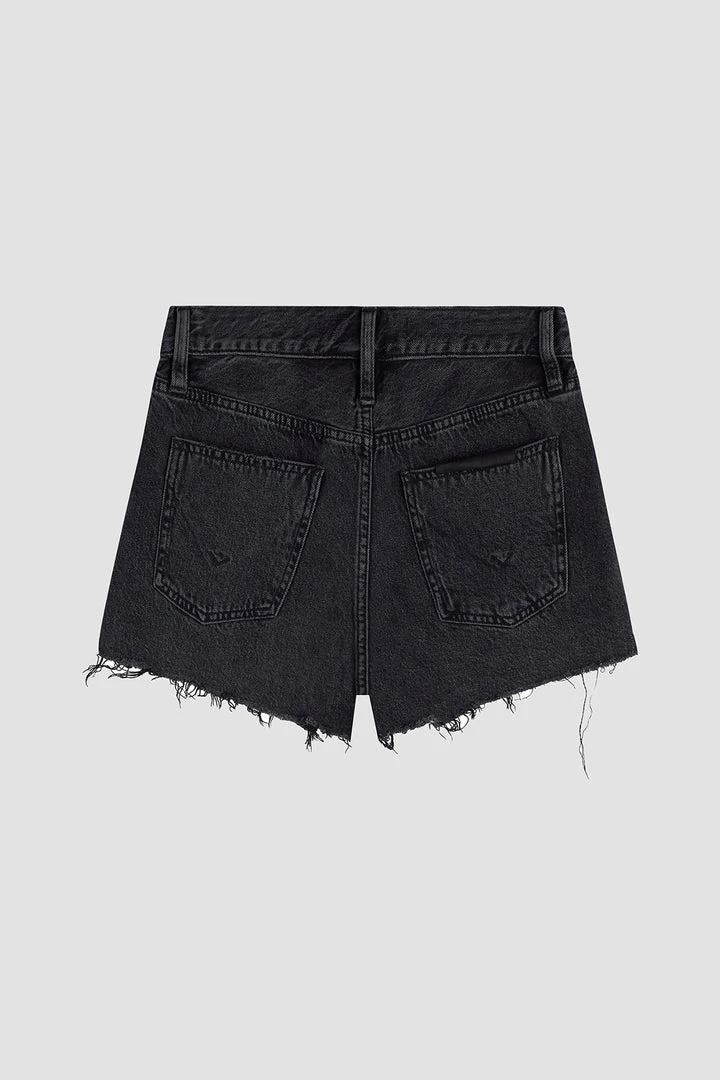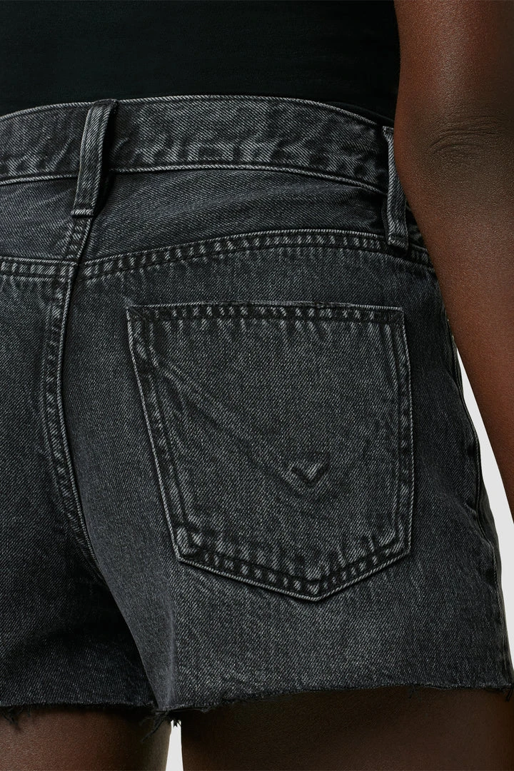 Made from 100% cotton rigid denim, our Lori High-Rise Short in the black Night Fever wash is cut loose for a roomier fit. Features a cutoff hem and expert fading for added vintage flavor.