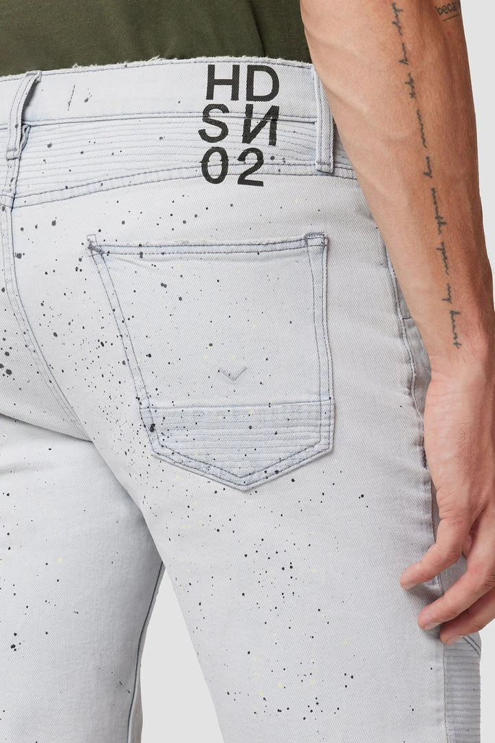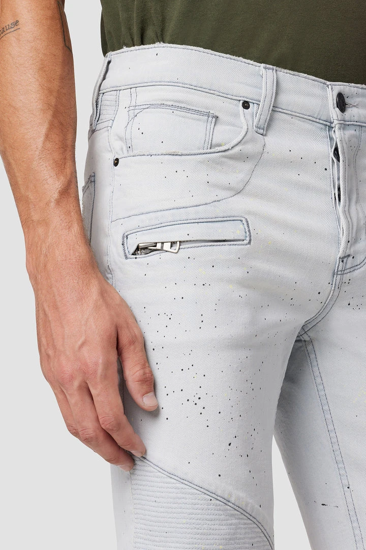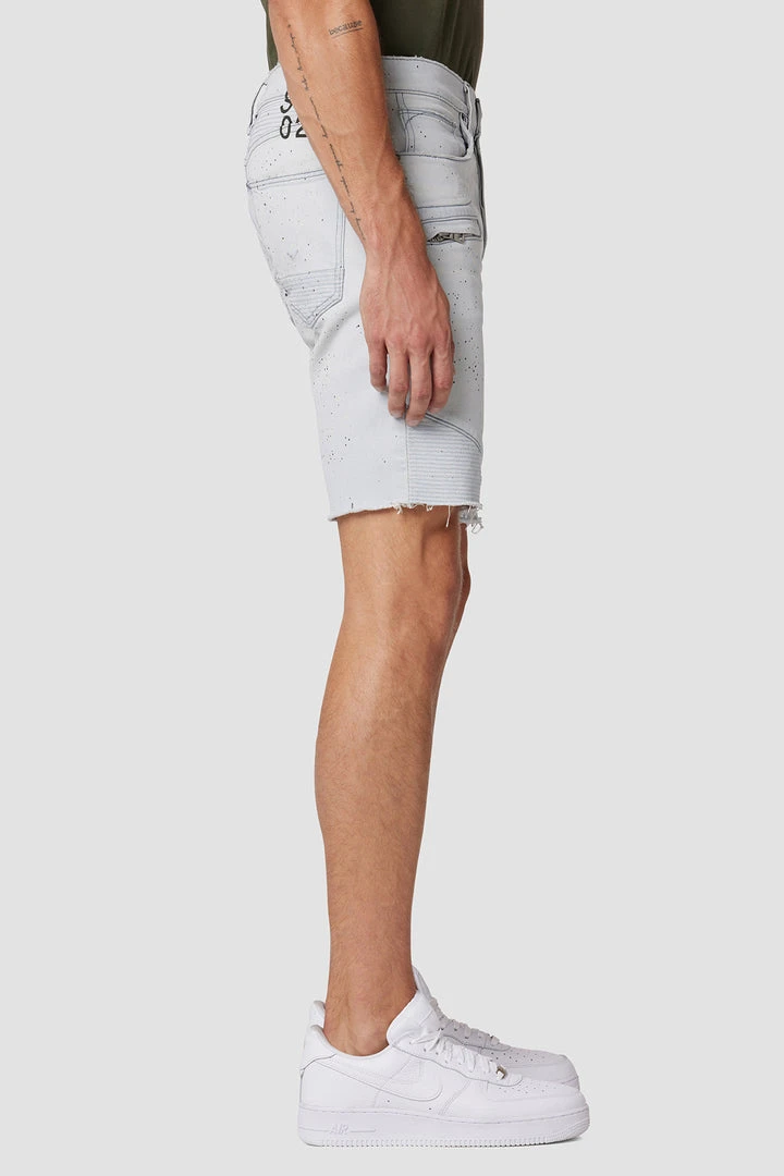 Our moto-inspired Blinder Short is cut slim from premium denim with a hint of stretch for added softness, comfort, and flexibility. The paint-splattered Confetti wash features two front zip pockets, ribbed leg panels, and a cutoff hem.