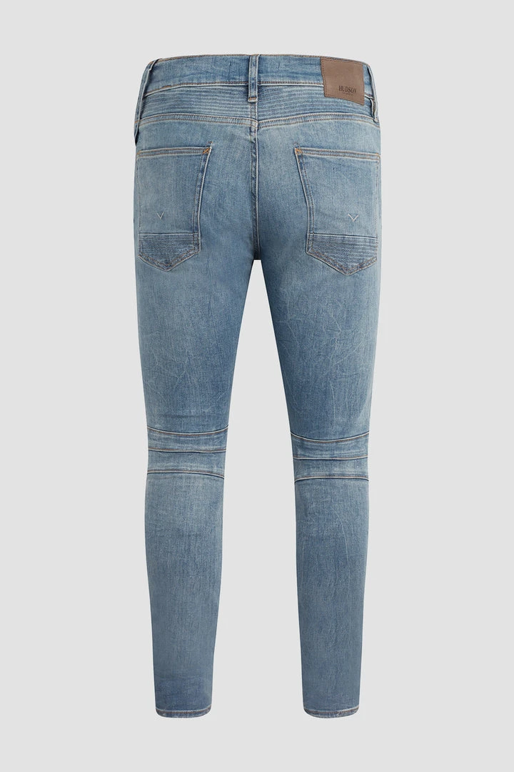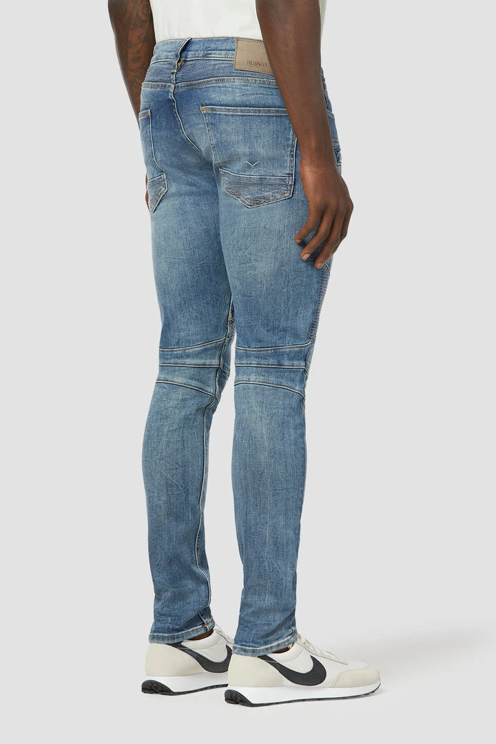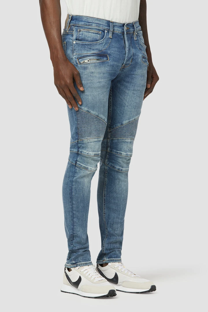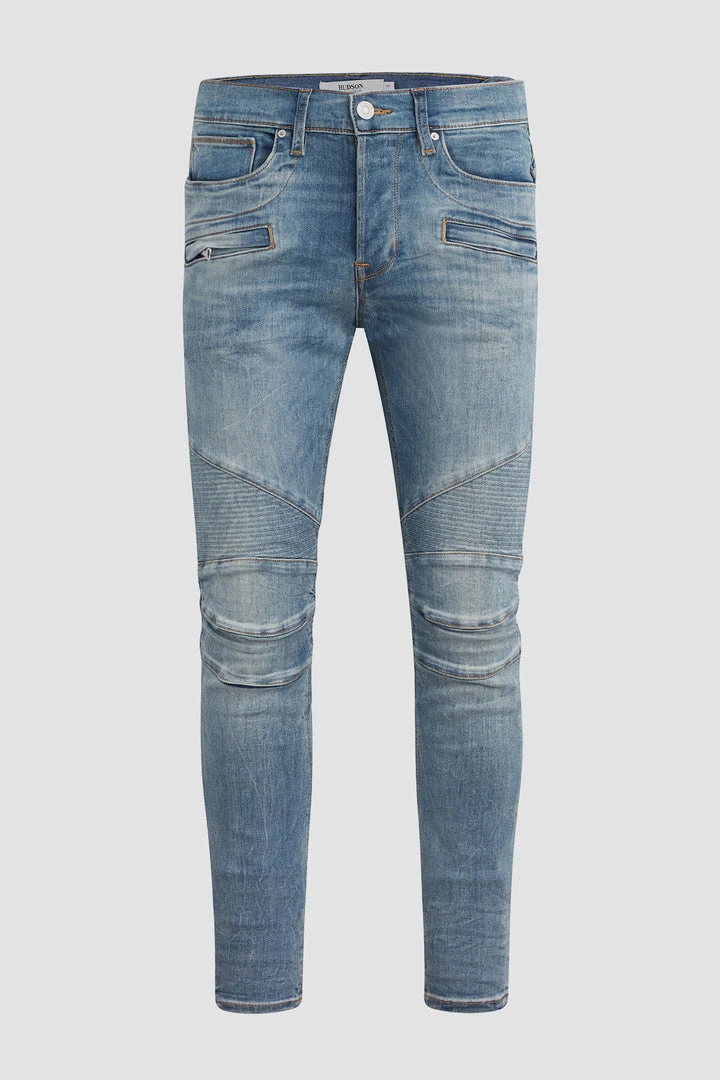 A fresh take on a Hudson favorite, our moto-inspired Blinder V.2 Skinny Biker is cut extra-slim from 10.25-ounce Italian denim with a hint of stretch for added softness, comfort, and flexibility. The medium-indigo Rally wash features two front zip pockets, ribbed leg panels, and expert fading.