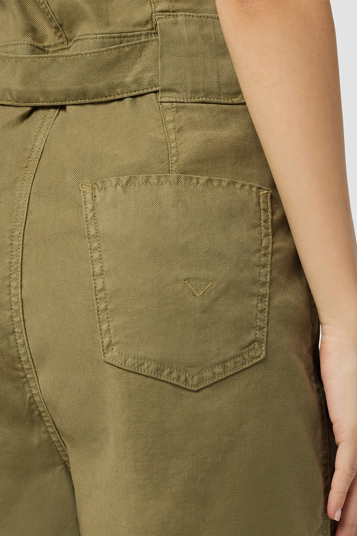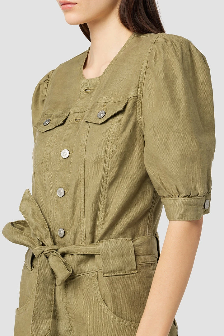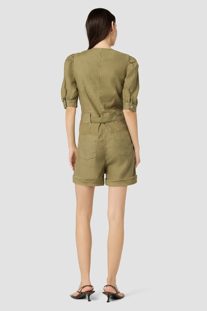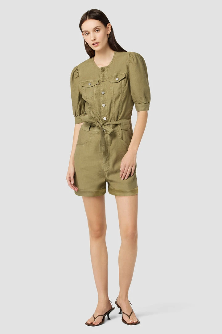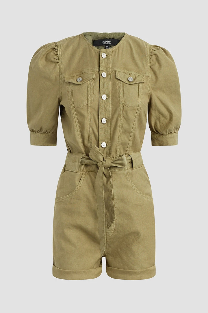 Our Puff Sleeve Romper in Moss Stone is cut from soft, airy twill with a tie waistband, two chest flap pockets, and generously cut sleeves.