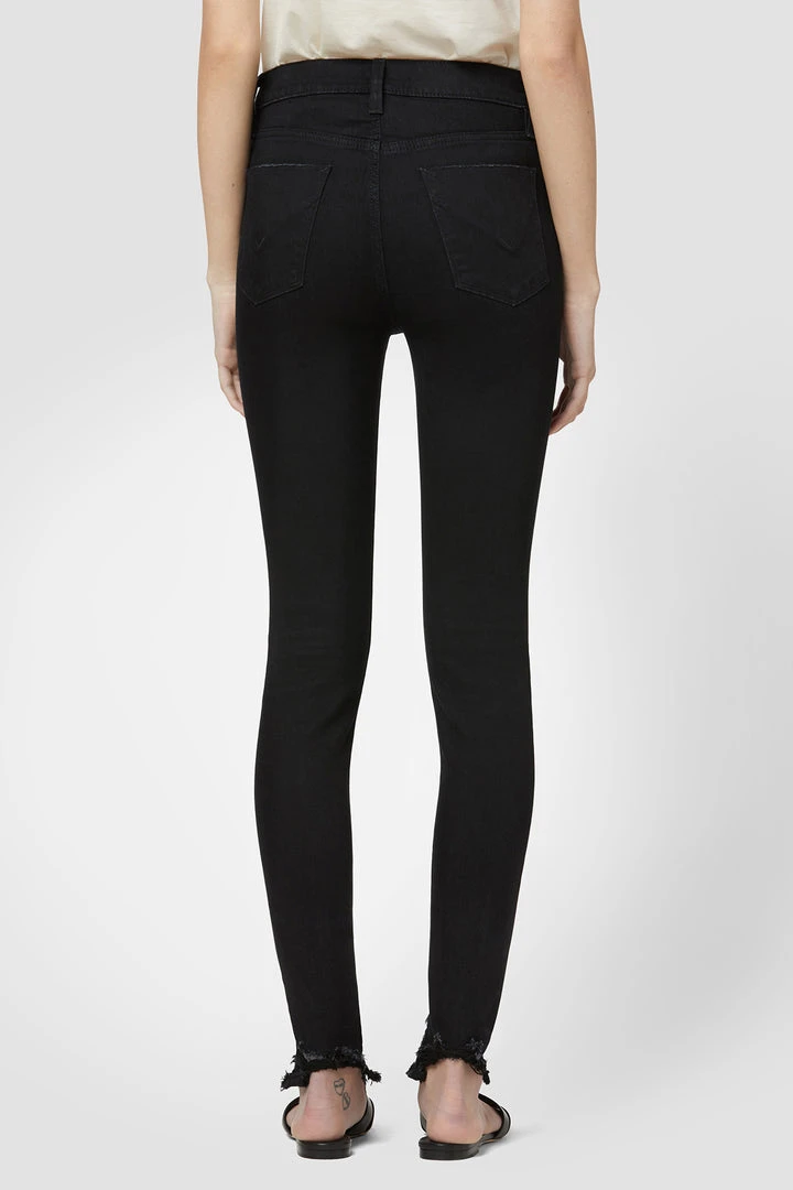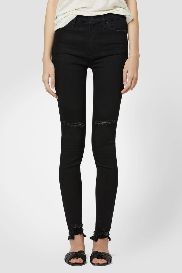 Our Barbara High-Rise Super Skinny Crop Jean in the black Evening Shadow wash is cut for a slim, contoured fit from premium super stretch denim. Features classic five-pocket details and a heavily destructed hem that’s cropped at the ideal ankle length.