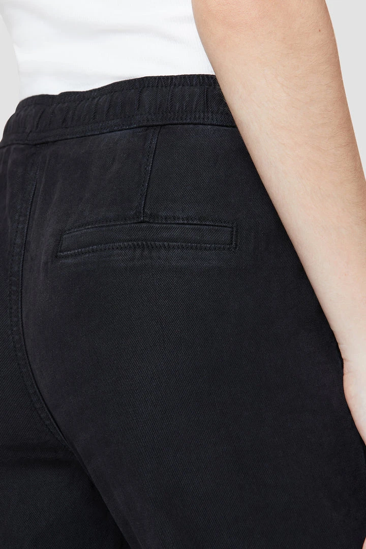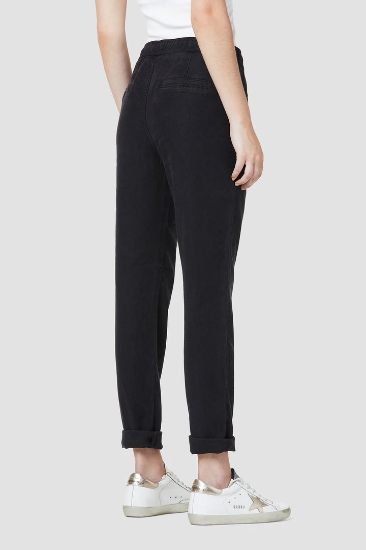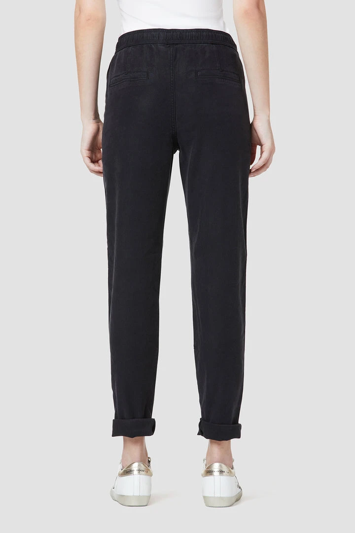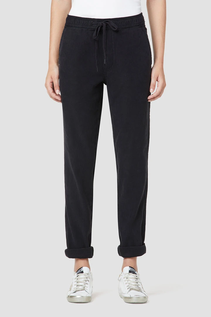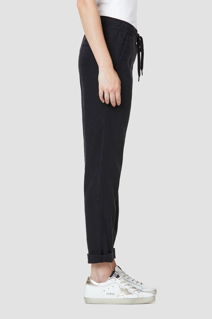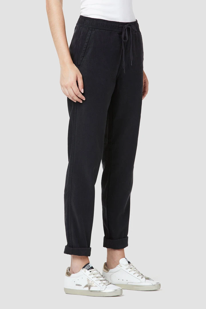 Our Lounge Track Pant with Rolled Hem in Black Beauty features an elastic drawstring waistband, folded hems, and a slim fit.