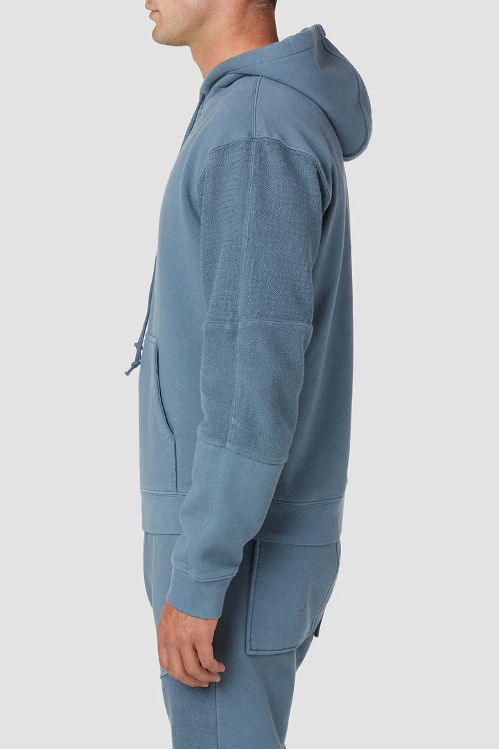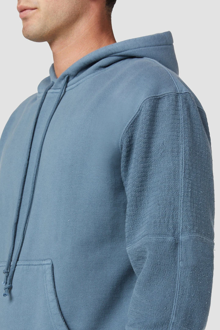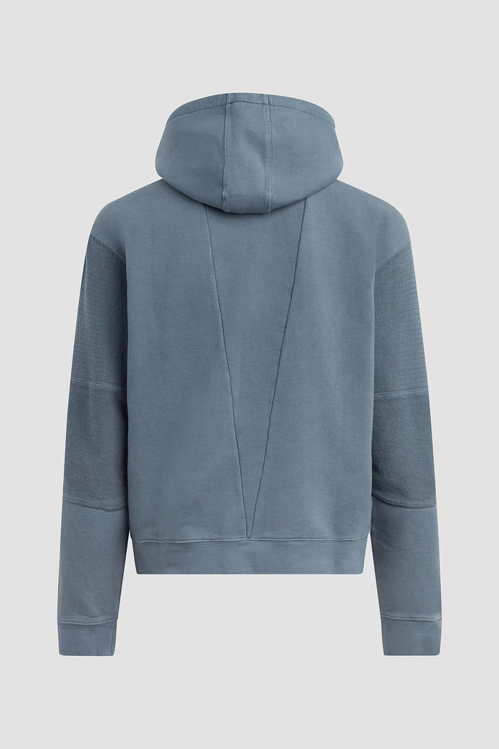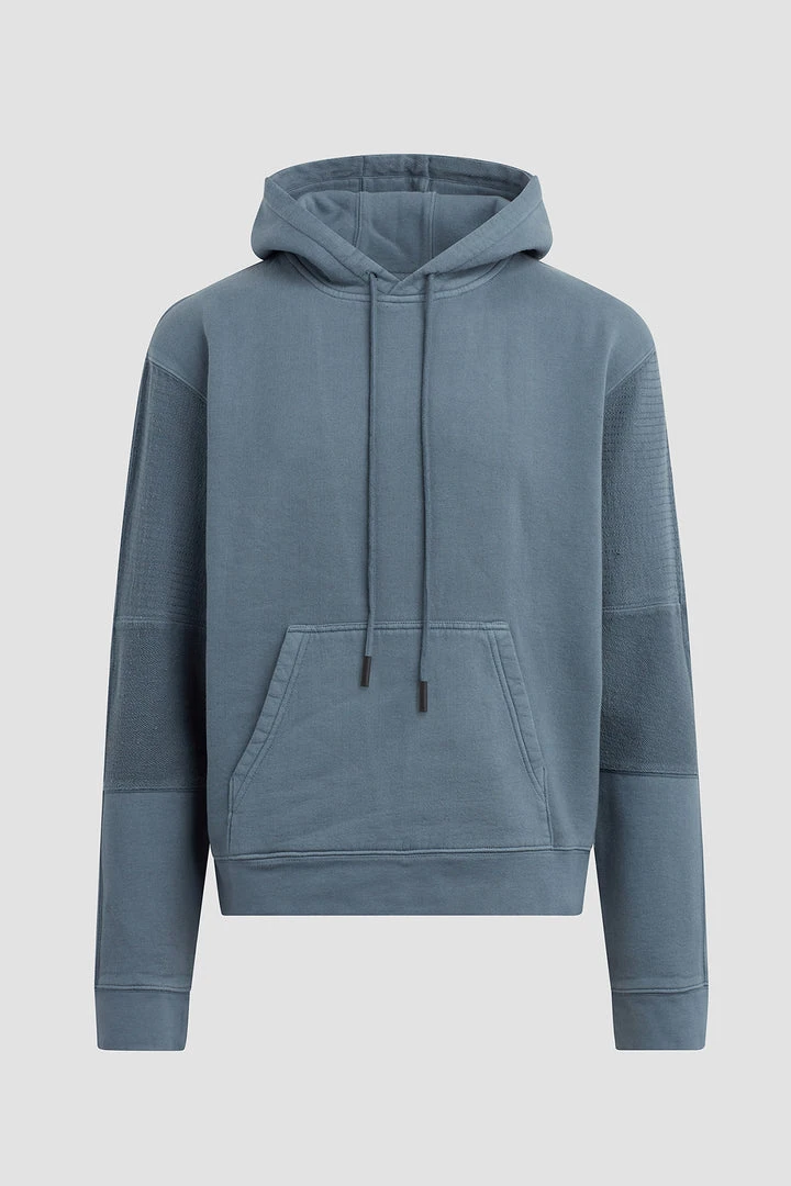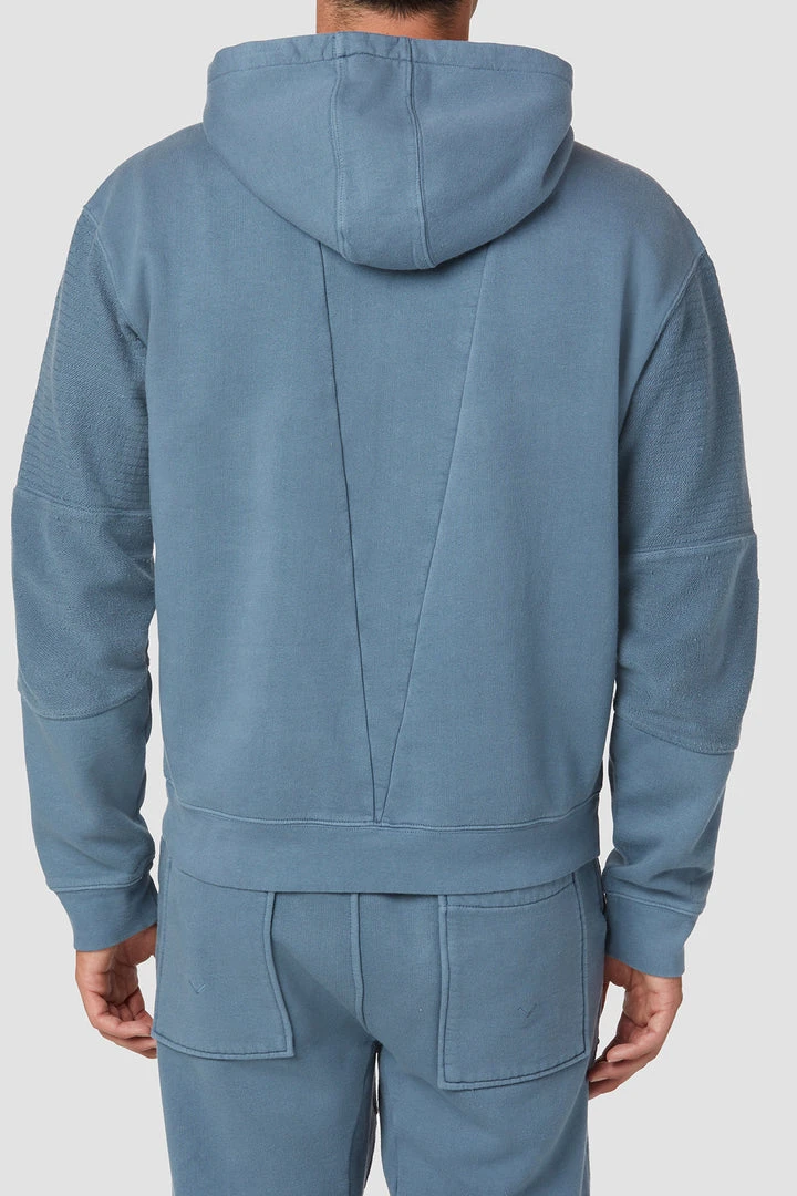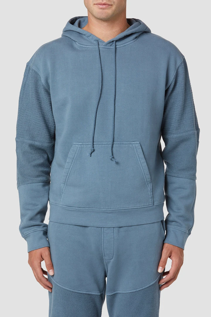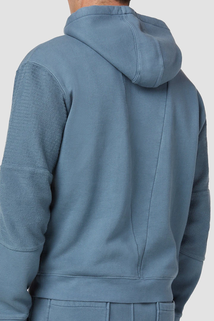 Not your average hoodie. Our Moto Hoodie in Stone Blue is cut for an easy fit with a kangaroo pocket and biker-inspired elbow details.
