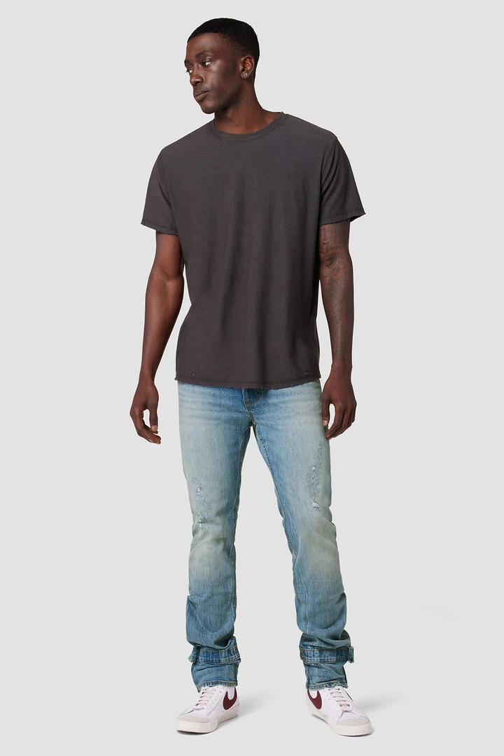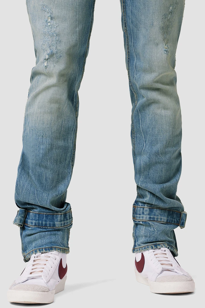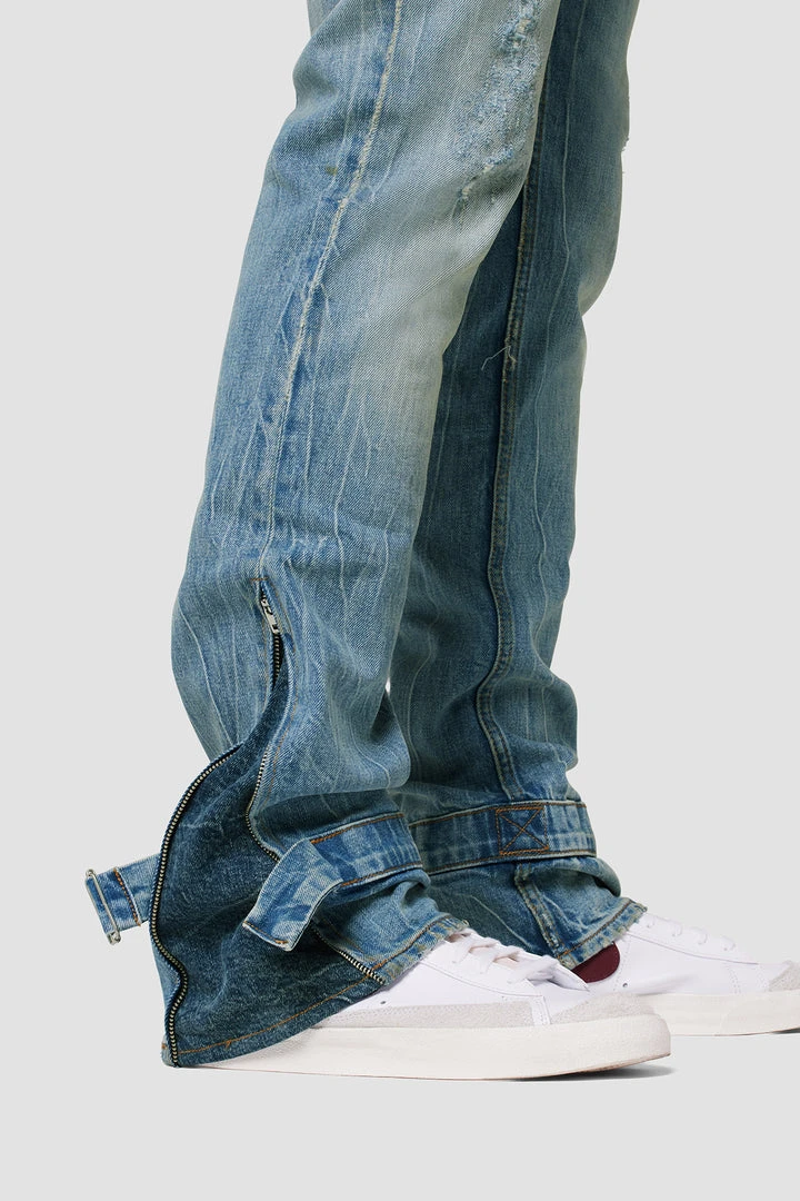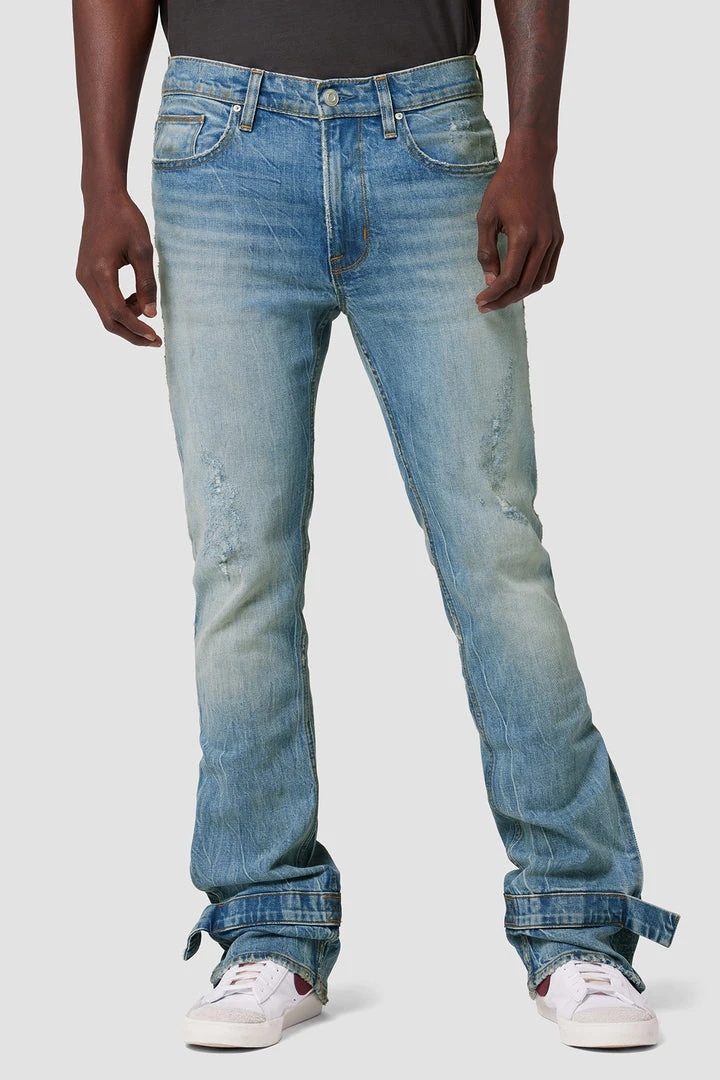 Our Jack Kick Flare Jean is cut for a slim fit with buckled, bootcut hems. The medium indigo Thunder wash is made from premium comfort stretch denim with vintage-feel distressing.