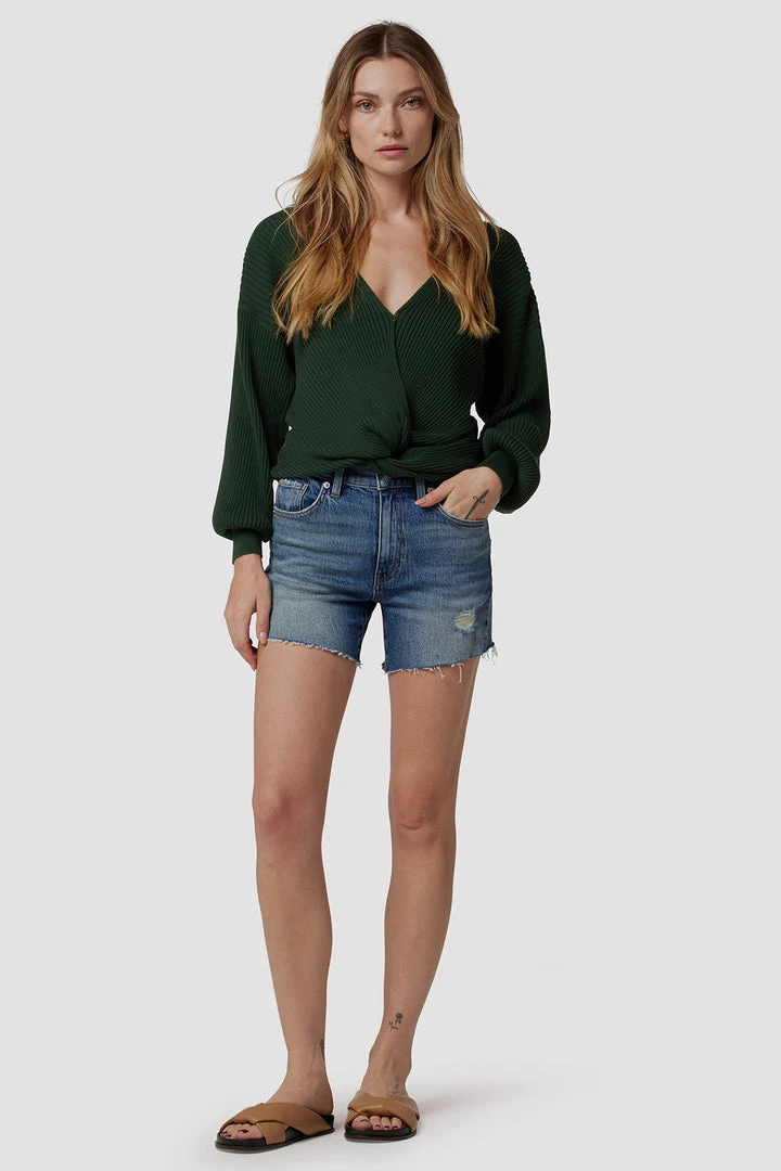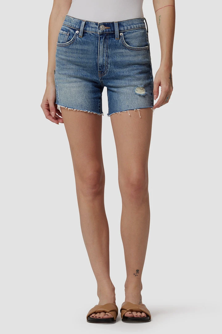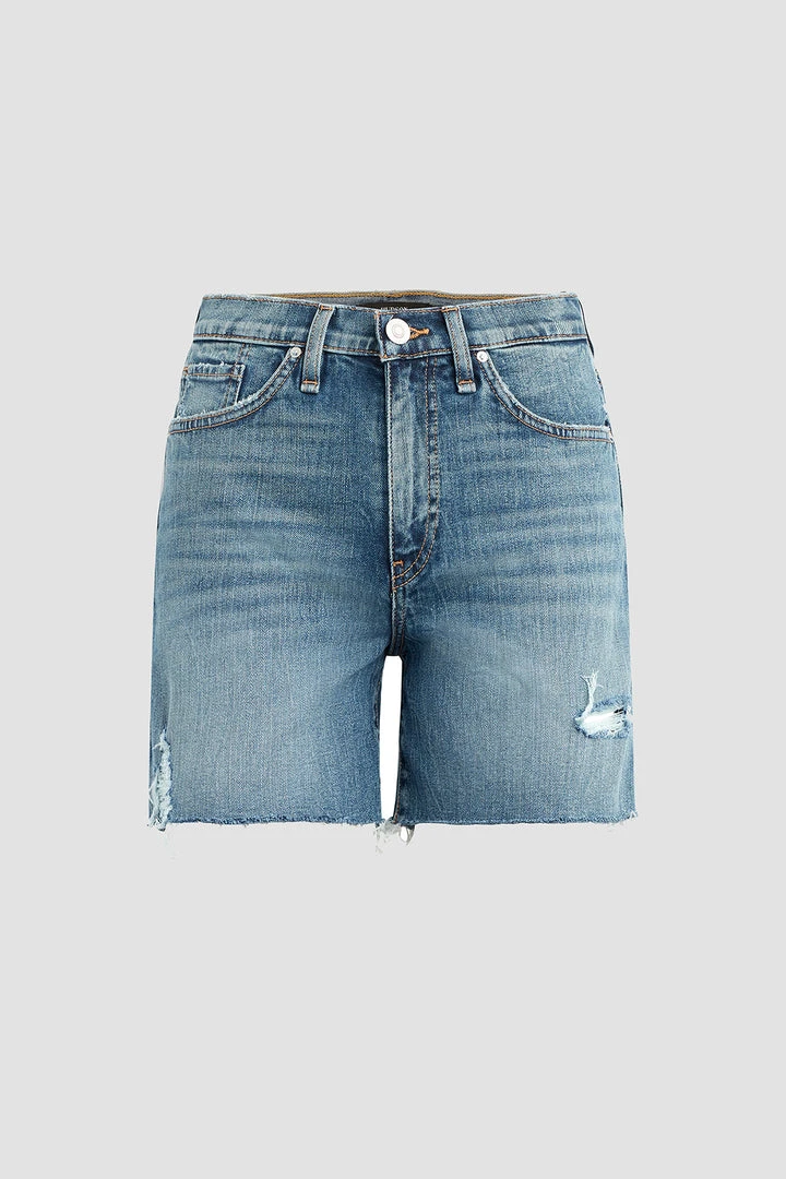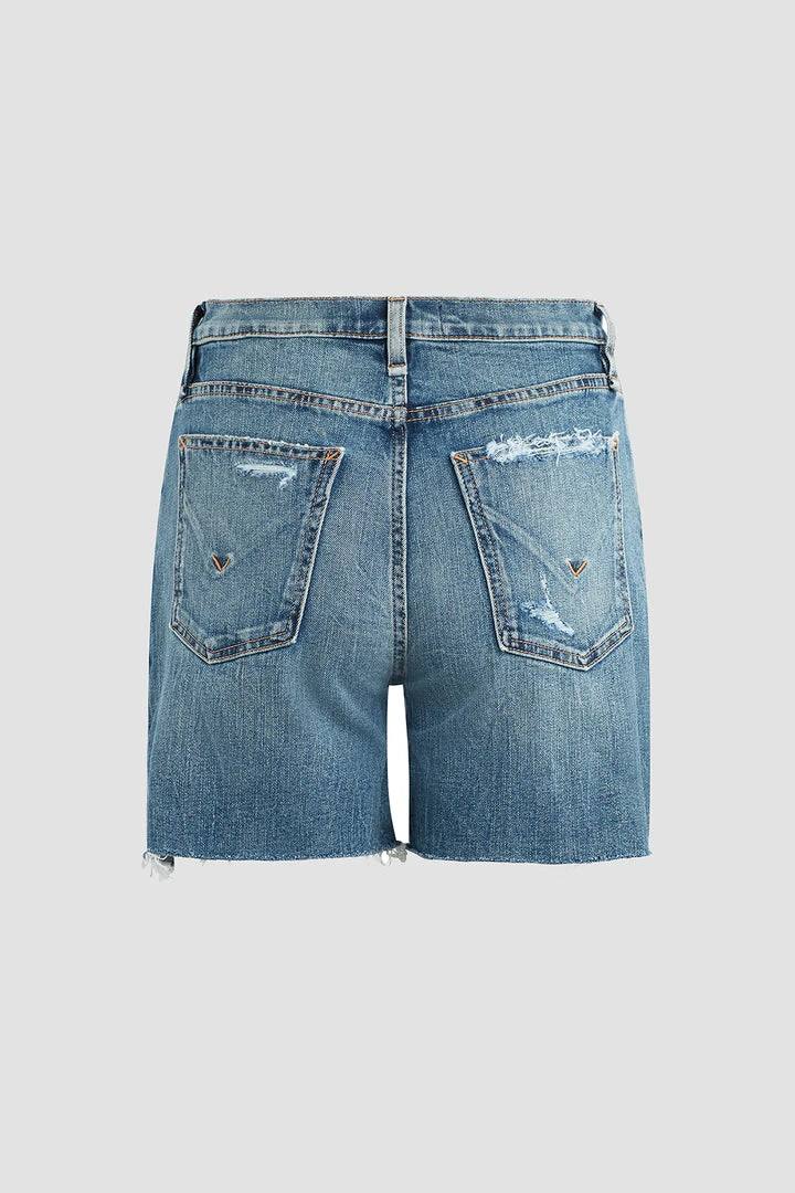 Made from premium comfort stretch denim, our Devon High-Rise Boyfriend Short in medium indigo Love Theme features a flattering high rise, long inseam, and casual cutoff hem.
