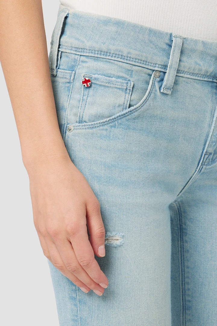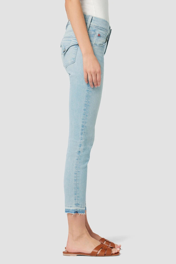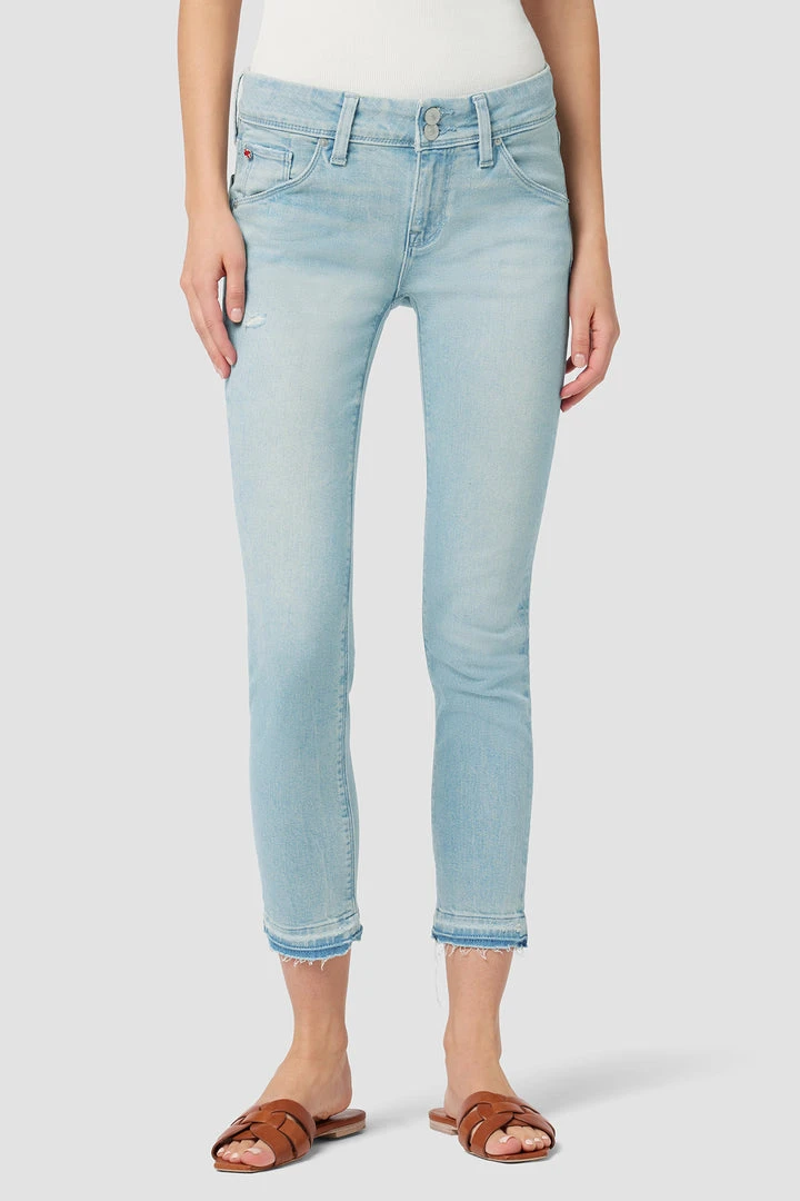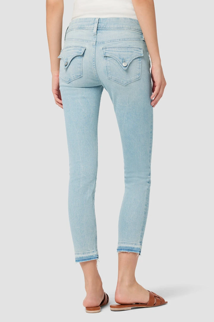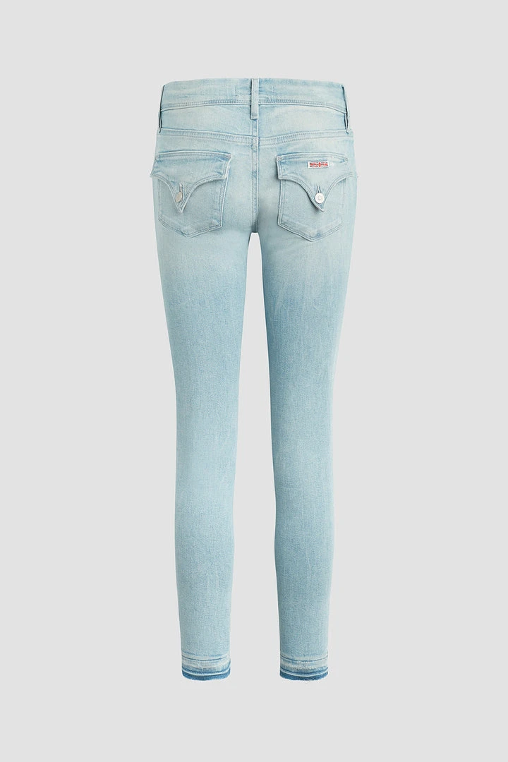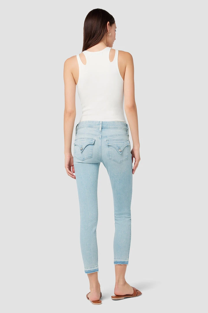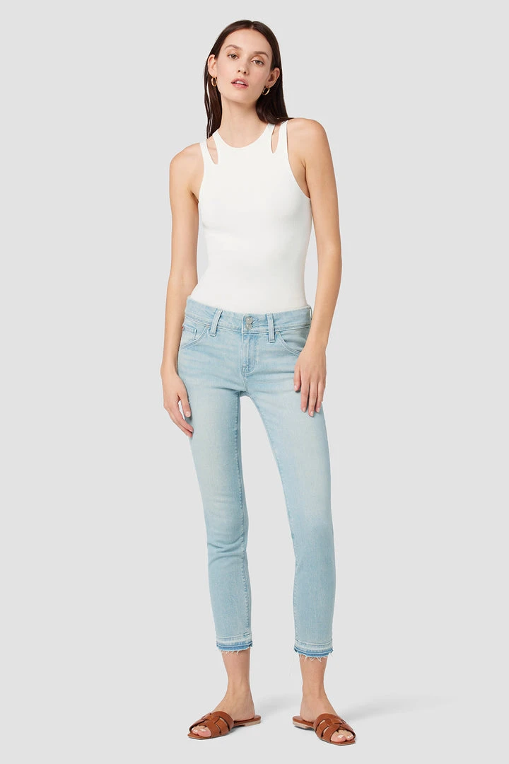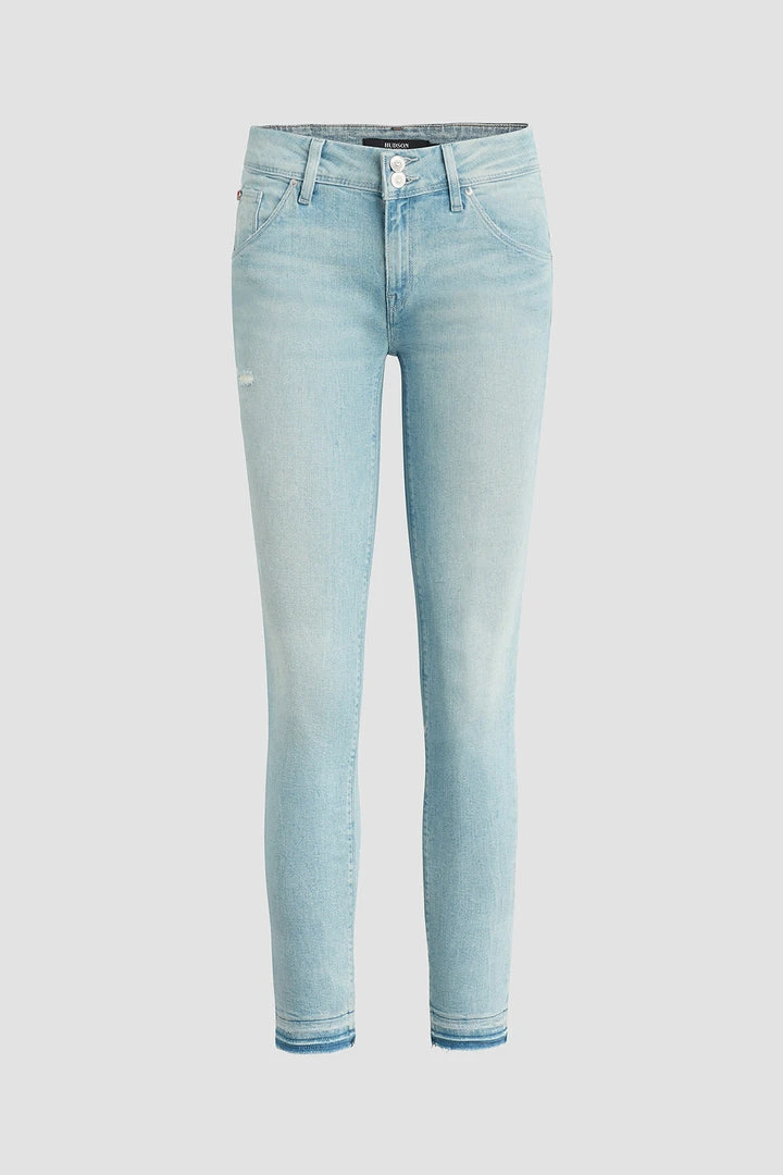 Cut with premium stretch denim, our Collin Mid-Rise Skinny Jean in light indigo Bombshell features gentle fading, a raw hem, and our signature button-flap back pockets.