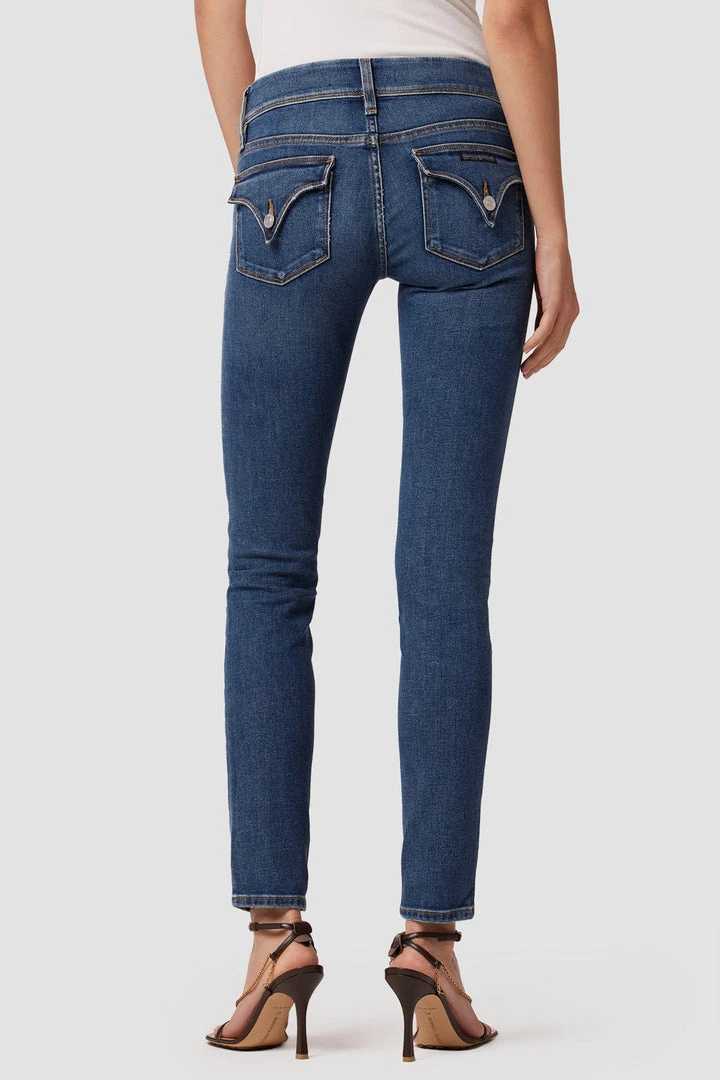 Cut with premium super stretch denim, our Collin Mid-Rise Skinny Jean in medium indigo Second Chance features classic contrast stitching, subtle fading, and our signature button-flap back pockets.