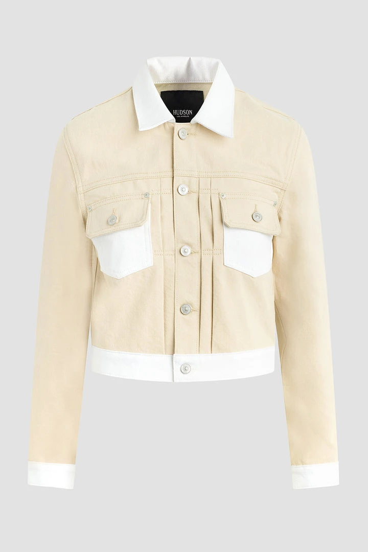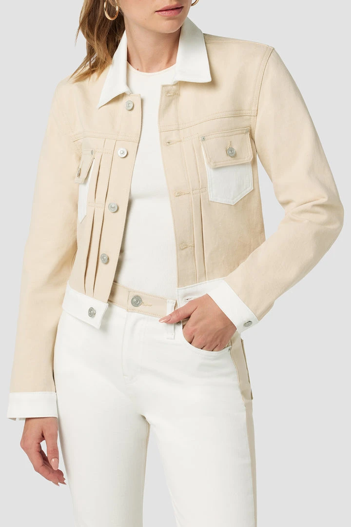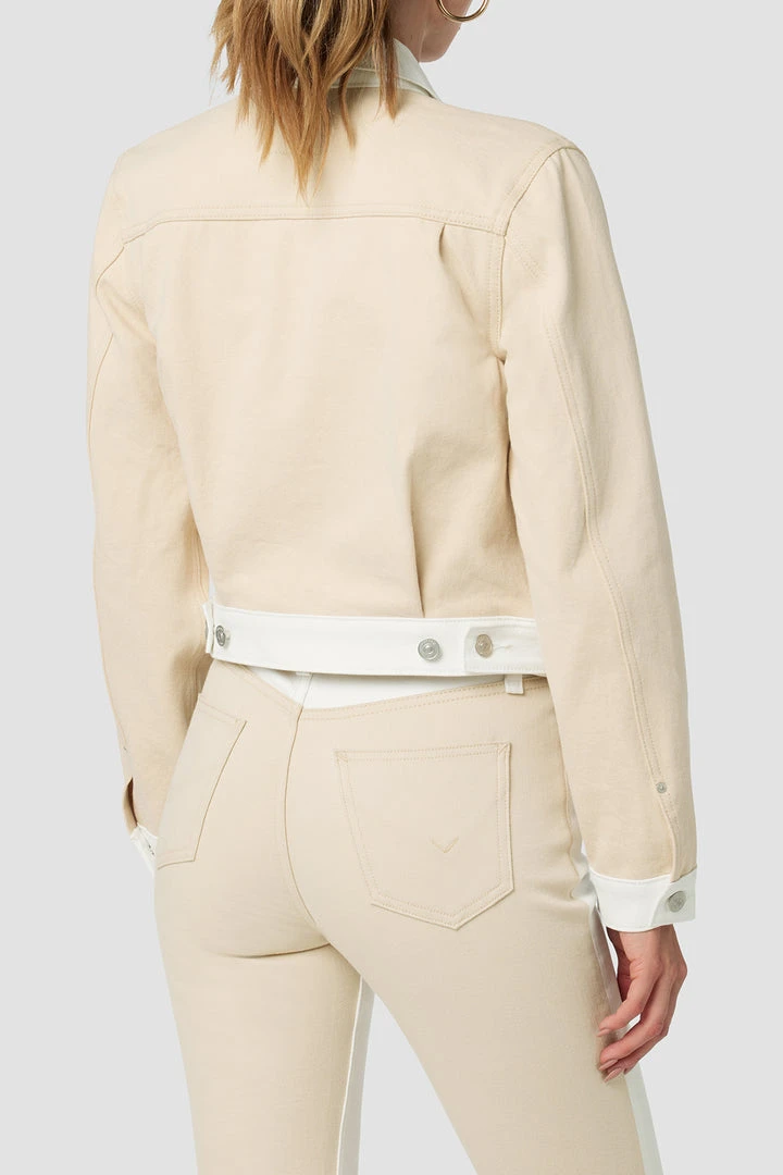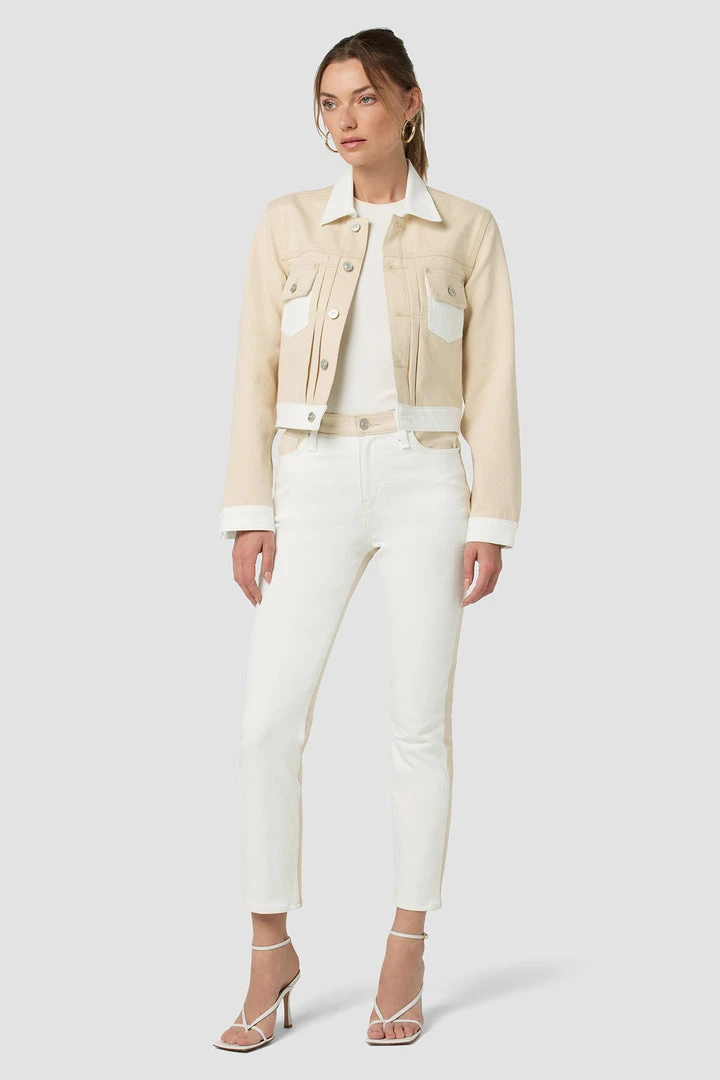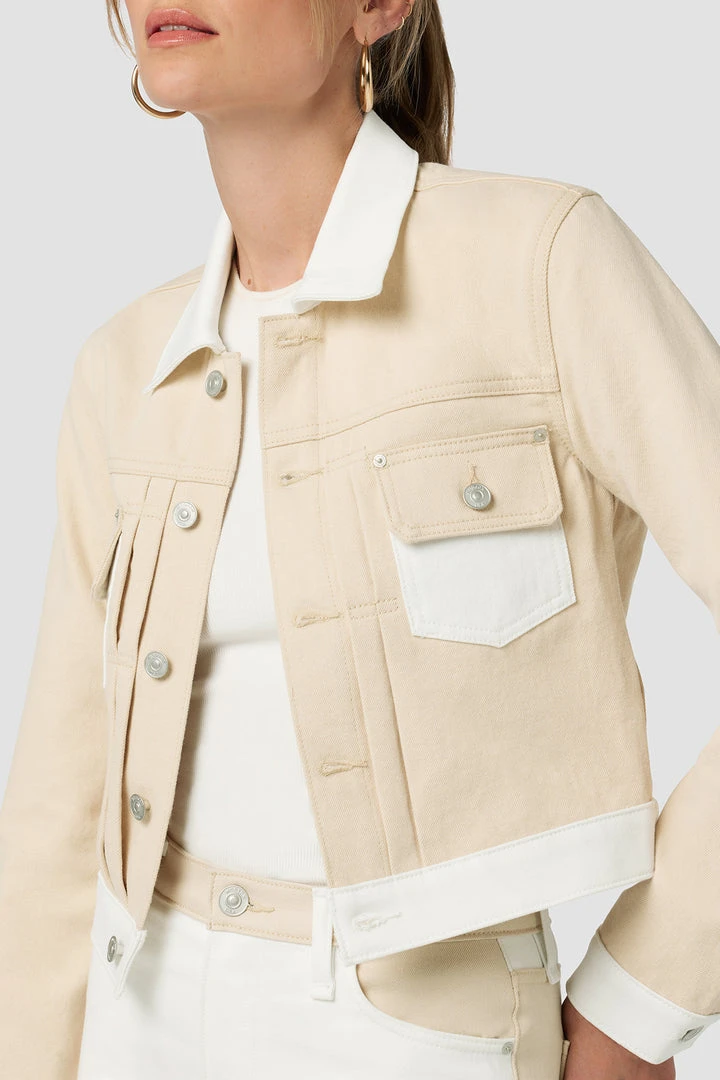 The layer you’ve been looking for. Our Lola Shrunken Trucker Jacket in two-tone Angora Colorblock is cut from premium non-stretch denim in a cropped silhouette.