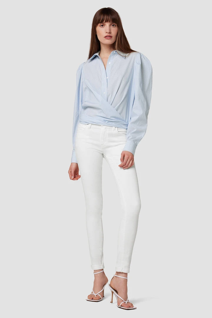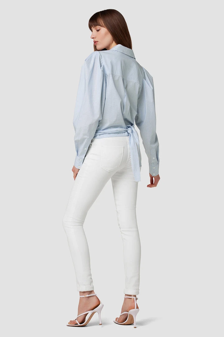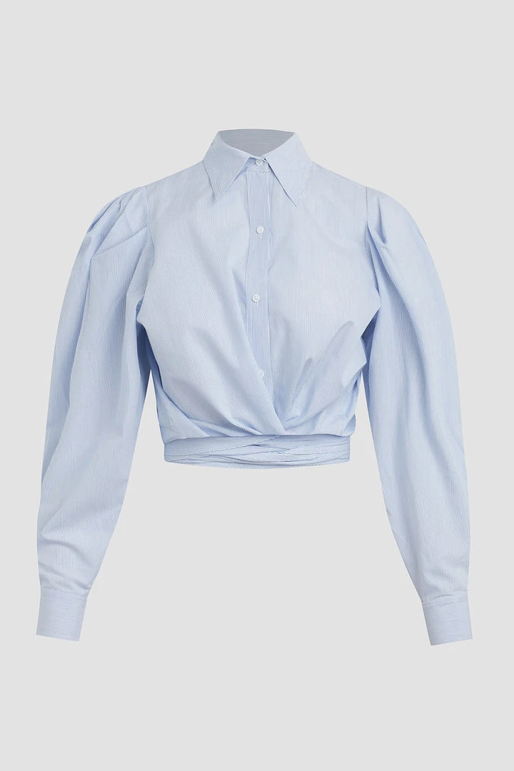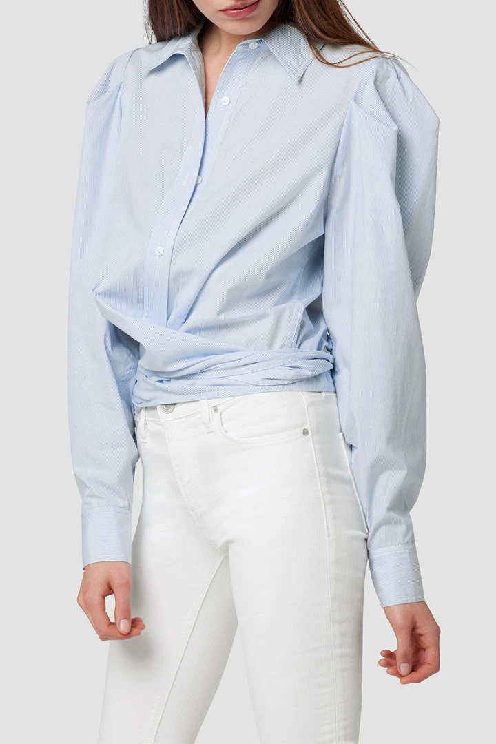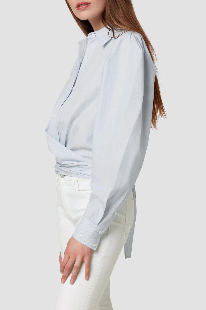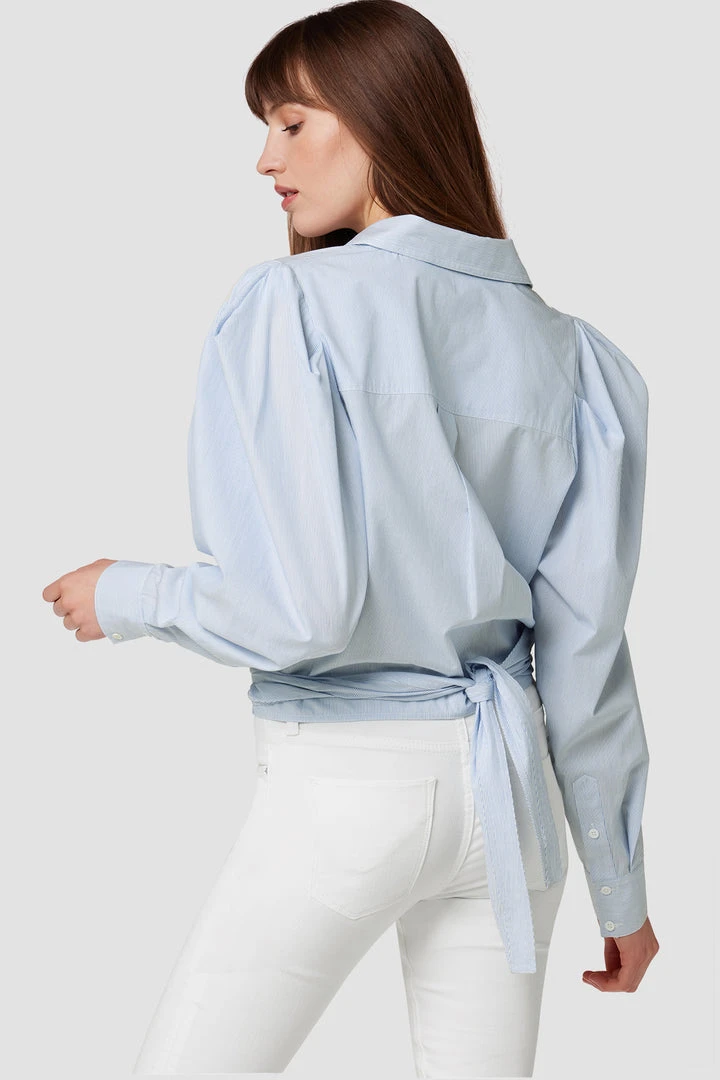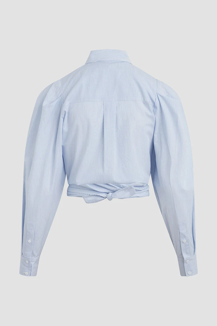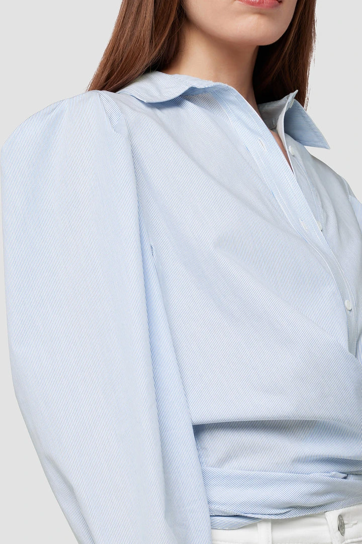 Cut from crisp cotton, our Wrap Poplin Button Up Shirt in Striped Bleached Dye features exaggerated sleeves, a straight collar, and a wrap tie hemline.