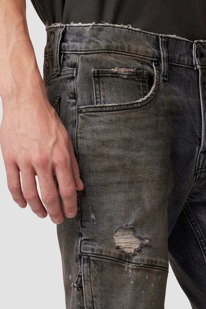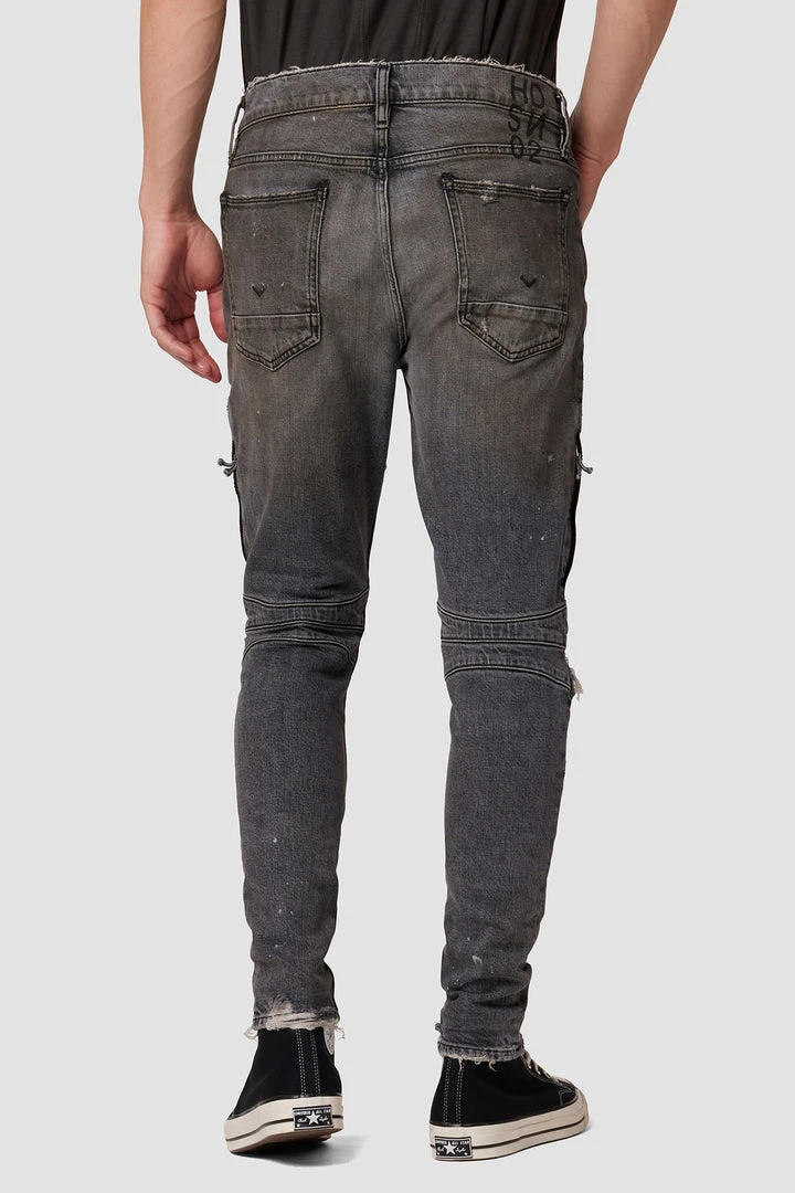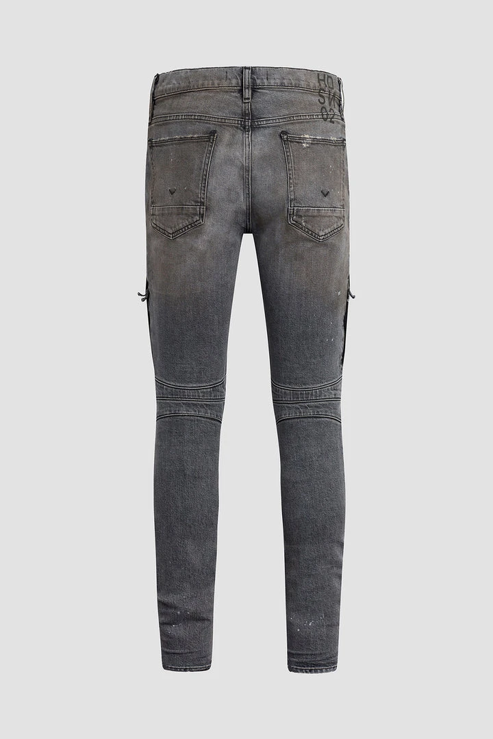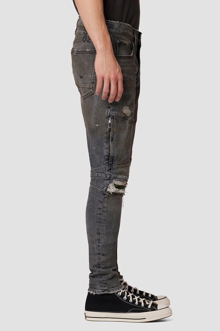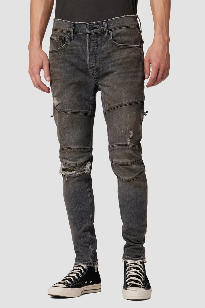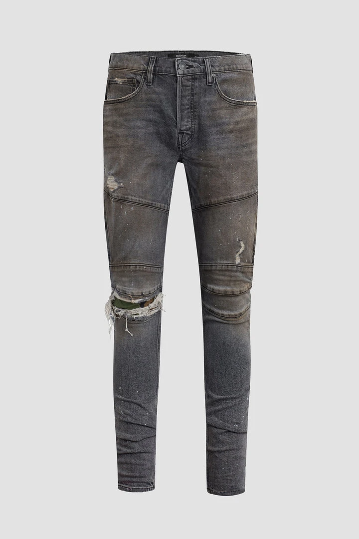 Extra-slim jeans with edge. Our Zack Biker Skinny is a mid-rise standout cut slim through the hip and thigh with a narrow leg. Made from premium comfort stretch denim, the Black Storm wash comes with moto-inspired details, distressing, and camo patch repair at the knee.